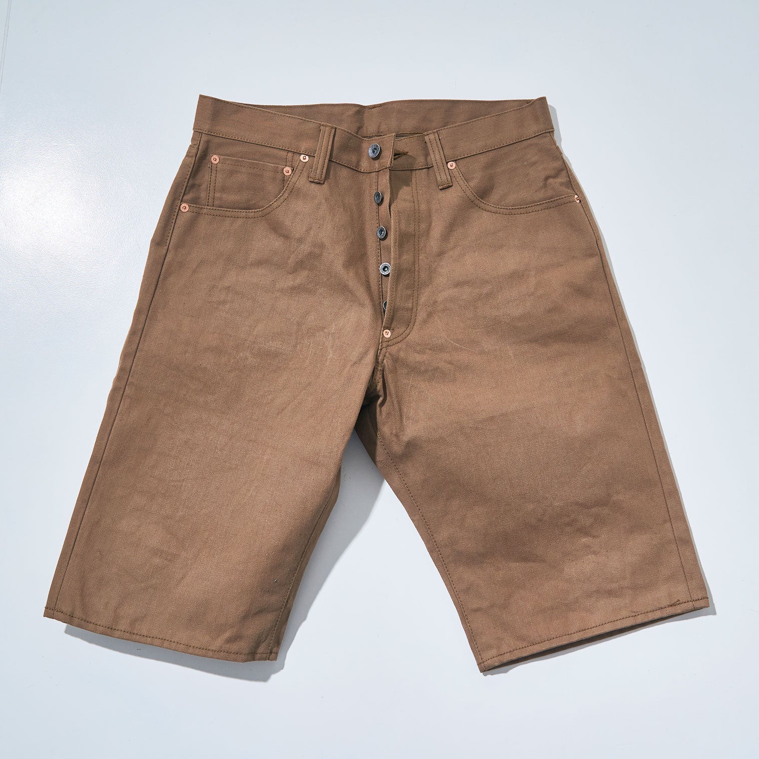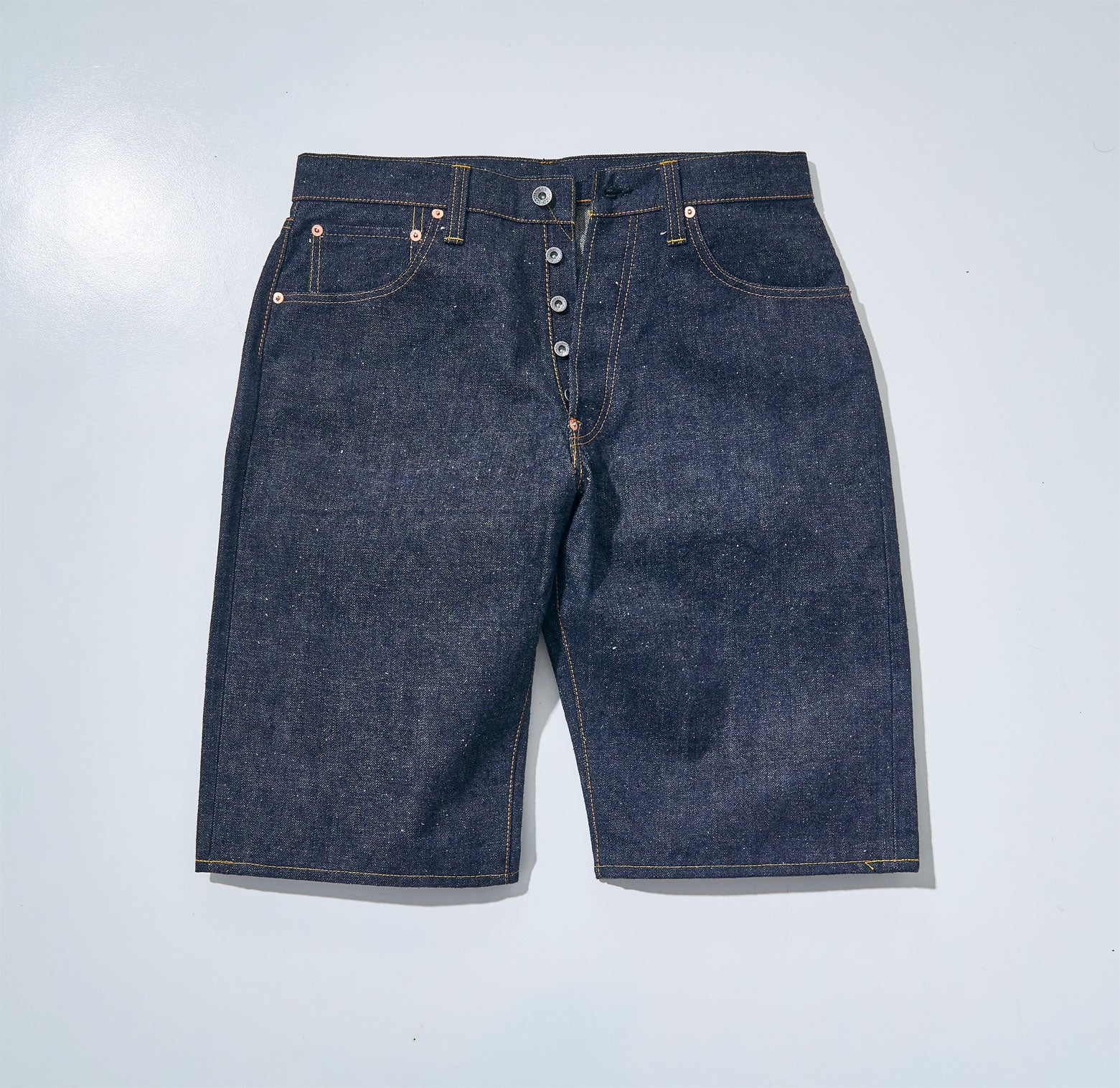 5ポケットジーンズのショートパンツ。パターンを見直し、これまでよりもウエスト他、全体的に大きくしました。生地は男気シリーズの15oz刀耳セルビッチデニム・SJ42CPでお馴染みの15ozセルビッチヘビィーチノを使用しています。短パンながらもヘビィー且つアタリ・色落ちも楽しめるものとなっています。仕様についても、ボタンを松ノ木に、スレーキを諸行無常ジャガード、インディゴは飾りステッチをイエローに一新しました。