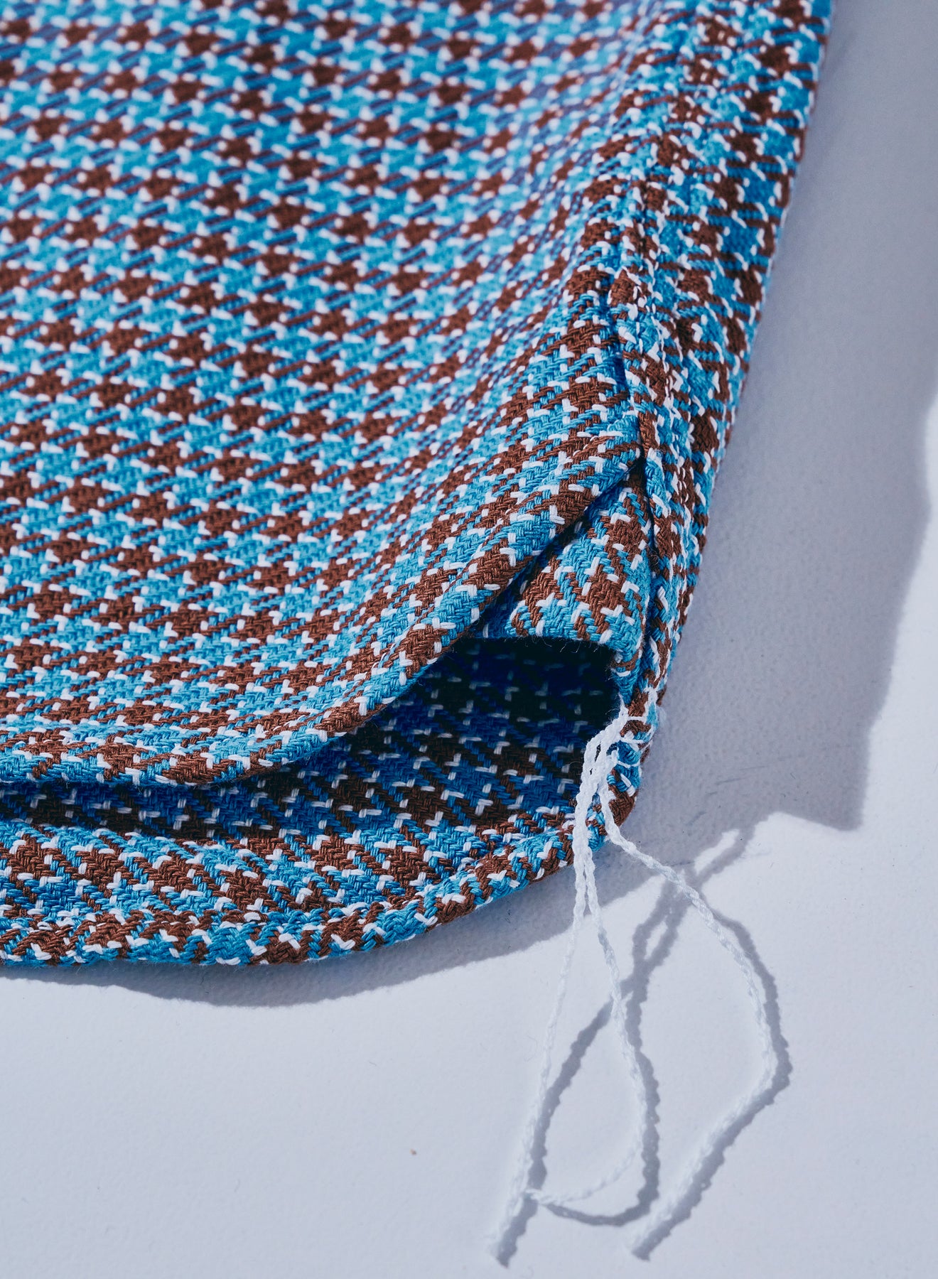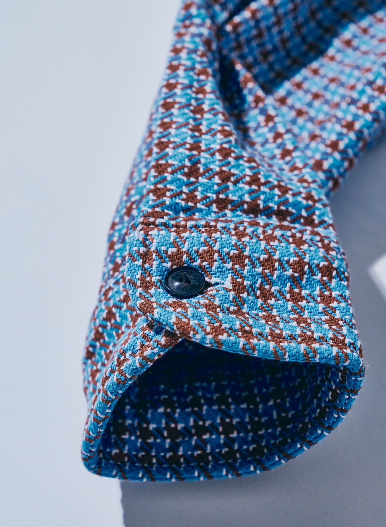 2/2綾で構成されたオリジナルチーズインディゴヘビーネル生地によるワークシャツです。ネル生地においては太番手のインディゴのチーズ染色糸と、特殊な反応染による糸色を合わせたヘビーネルチェックになります。全体的に同系色のまま退色していきます。