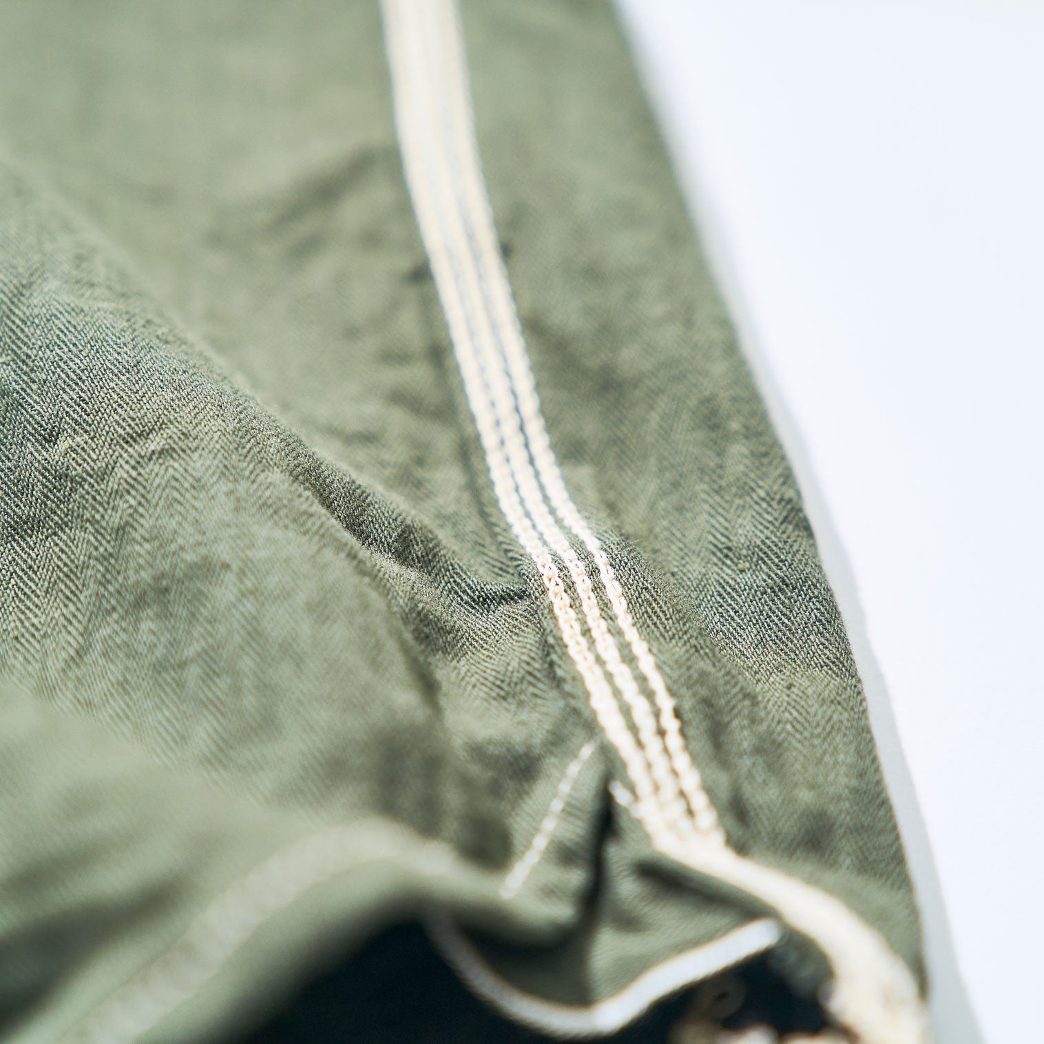 セルビッチヘリンボーン生地によるワークシャツです。生地は6oz程の耳付きのヘリンボーン生地で、4色共に雰囲気のある色味になっています。硫化染なので経年での色落ちやアタリが楽しめます。シャツはビンテージにみられる左右非対称のポケットで、袖は3枚仕立てにしています。裾マチと下前端に加え、袖裏にもセルビッチをあしらいました。縫製はキナリ綿糸を使い、3本ステッチ巻縫いがメインの力強い仕様ですが、太番手細番手の使い方、2本ステッチの幅や、運針の使い分けなど、各部にメリハリを持たせたこだわりの仕様としています。また、脇から袖に入る3本ステッチは、環縫い表出しのユニークな仕様となっています。SAMURAI刻印入りのナットボタンを茶色に染めたものを使用しています。