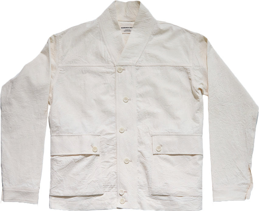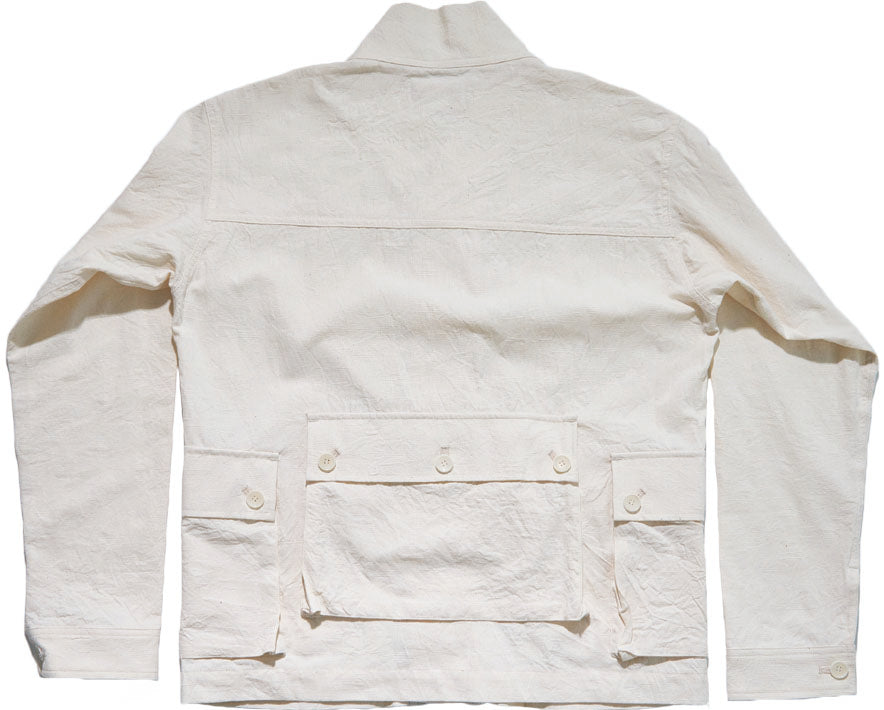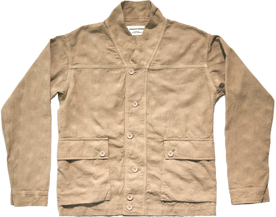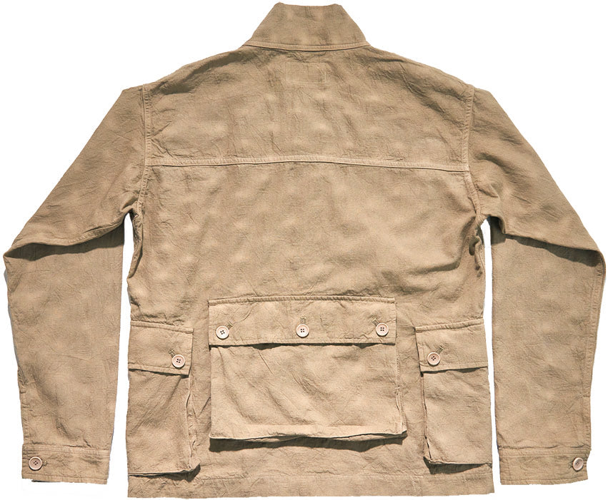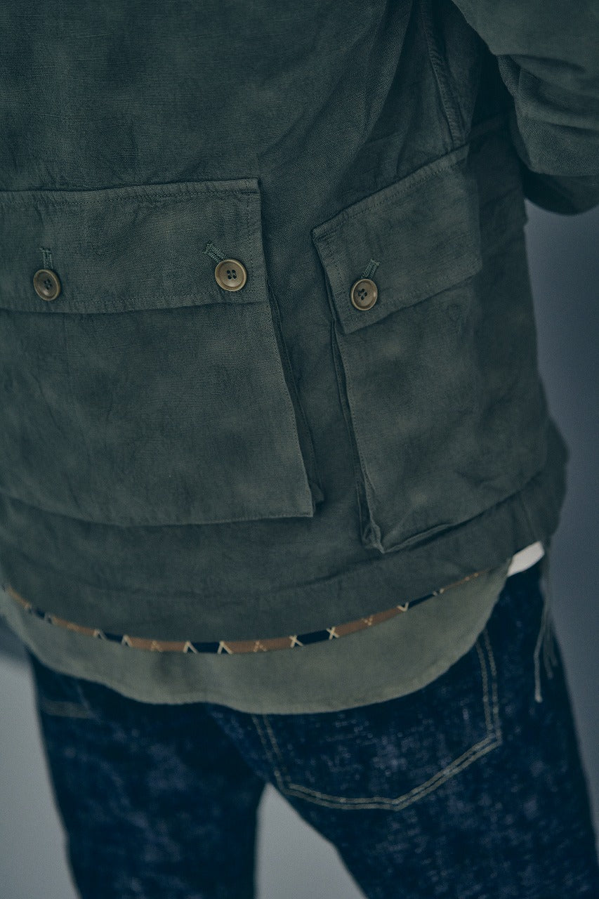 半世紀以上前、熱帯地域用に開発されたミリタリーファブリックを解析、日本独自の織布技術をもって昇華させて生地です。パナマ組織とも見て取れるその生地は、似て非なるものであり、スラブ糸によって凹凸があること、そのメッシュのような生地感が夏の着用を快適にしてくれます。すでに歴史がこの生地の有用性を証明していますが、さらに、100年続く日本一の播州の機屋にて、独自のアレンジを加え、より通気性の良い生地に仕上がっています。トロピカルウェザー生地によるカーディガン。その存在感を存分に発揮できるよう、軽く羽織れるミリタリースタイルのジャケットに仕上げています。容量の大きいポケットにはマチをつけ、本縫いを中心とした縫製で、堅牢な作りになっています。