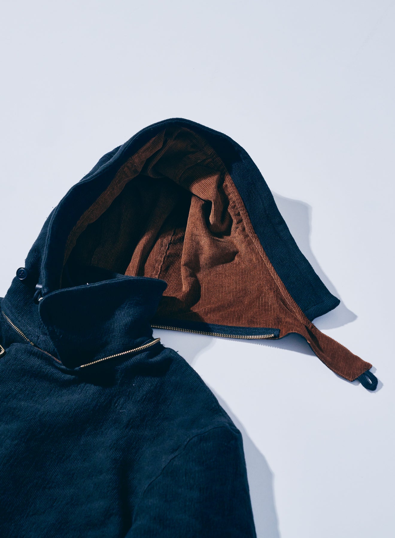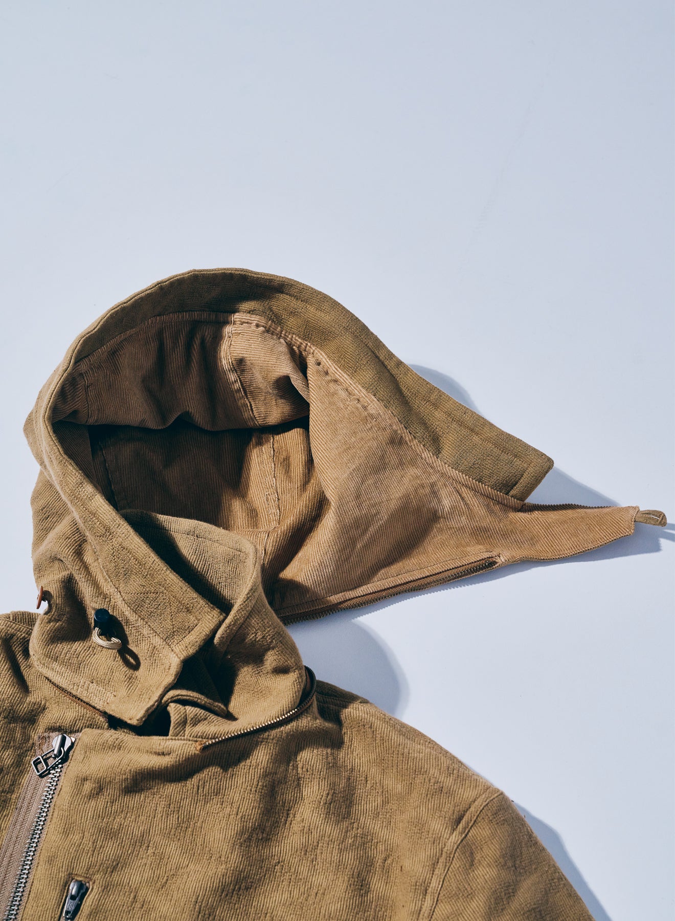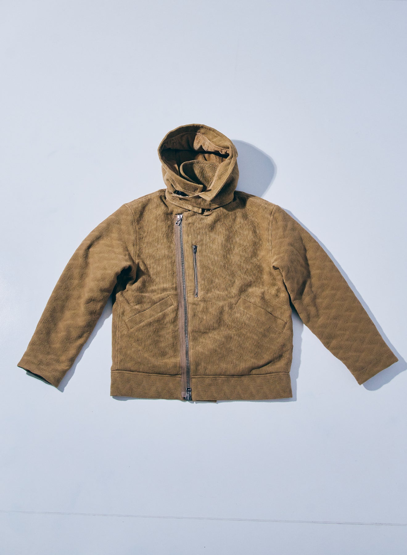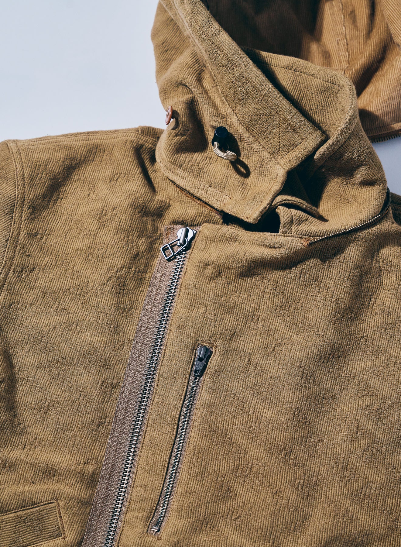 特徴的なディテールを持つショート丈のミリタリ―ジャケットをベースに、同じく特徴的な生地であるジャギーデッキクロスを用いた中綿ジャケット。ジッパーで脱着可能なフードの口には形状記憶素材が入り、また、フード内部にはコーデュロイを配置することで、機能に優れる中綿と相まって、高い保温性を持ちます。また、アームホールはやや太めに設定、肩周りに余裕を持たせた立体的なパターンにより、腕周りの可動域も確保しています。