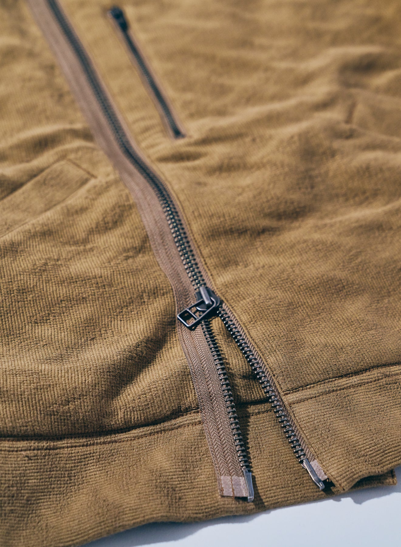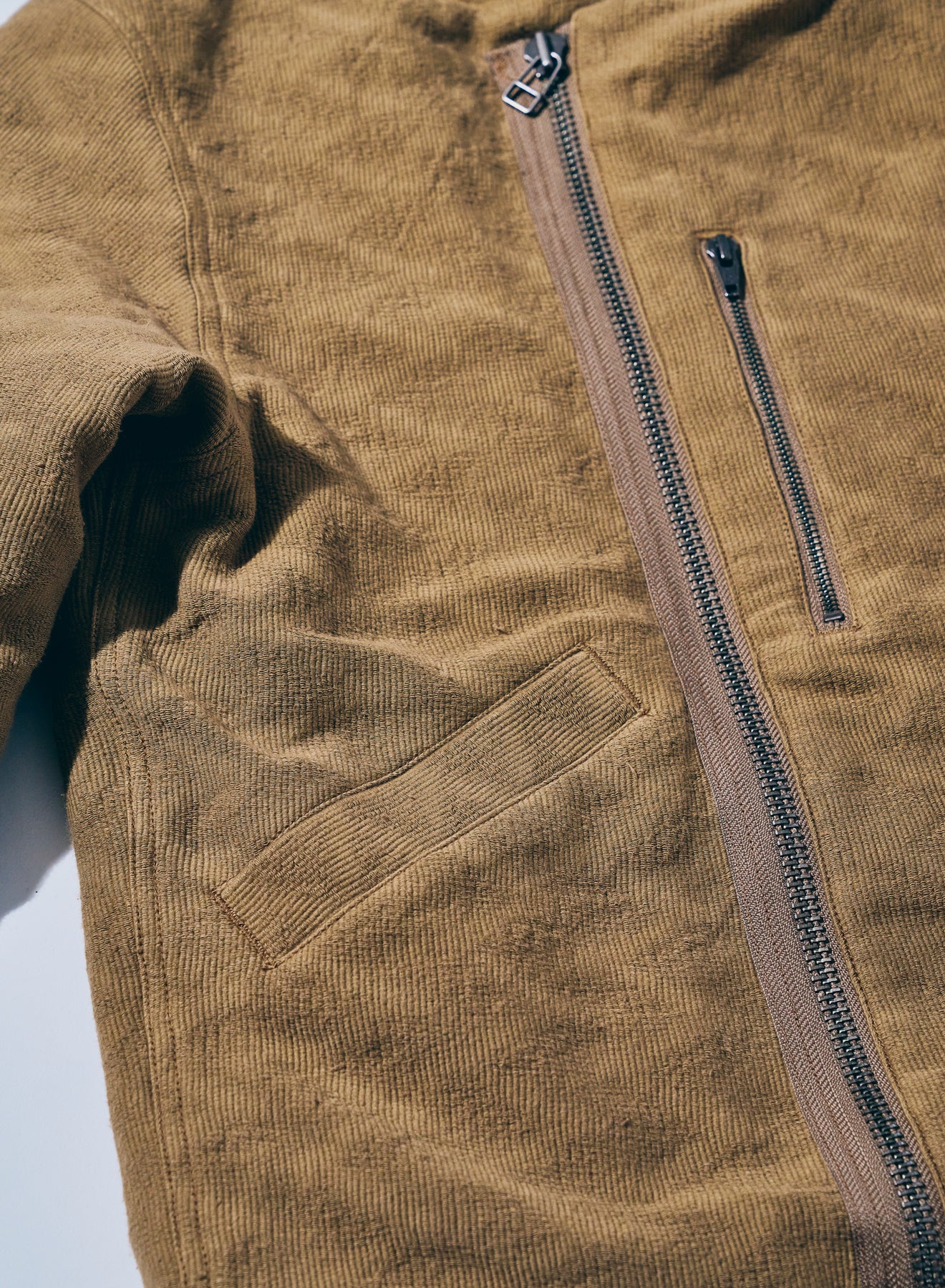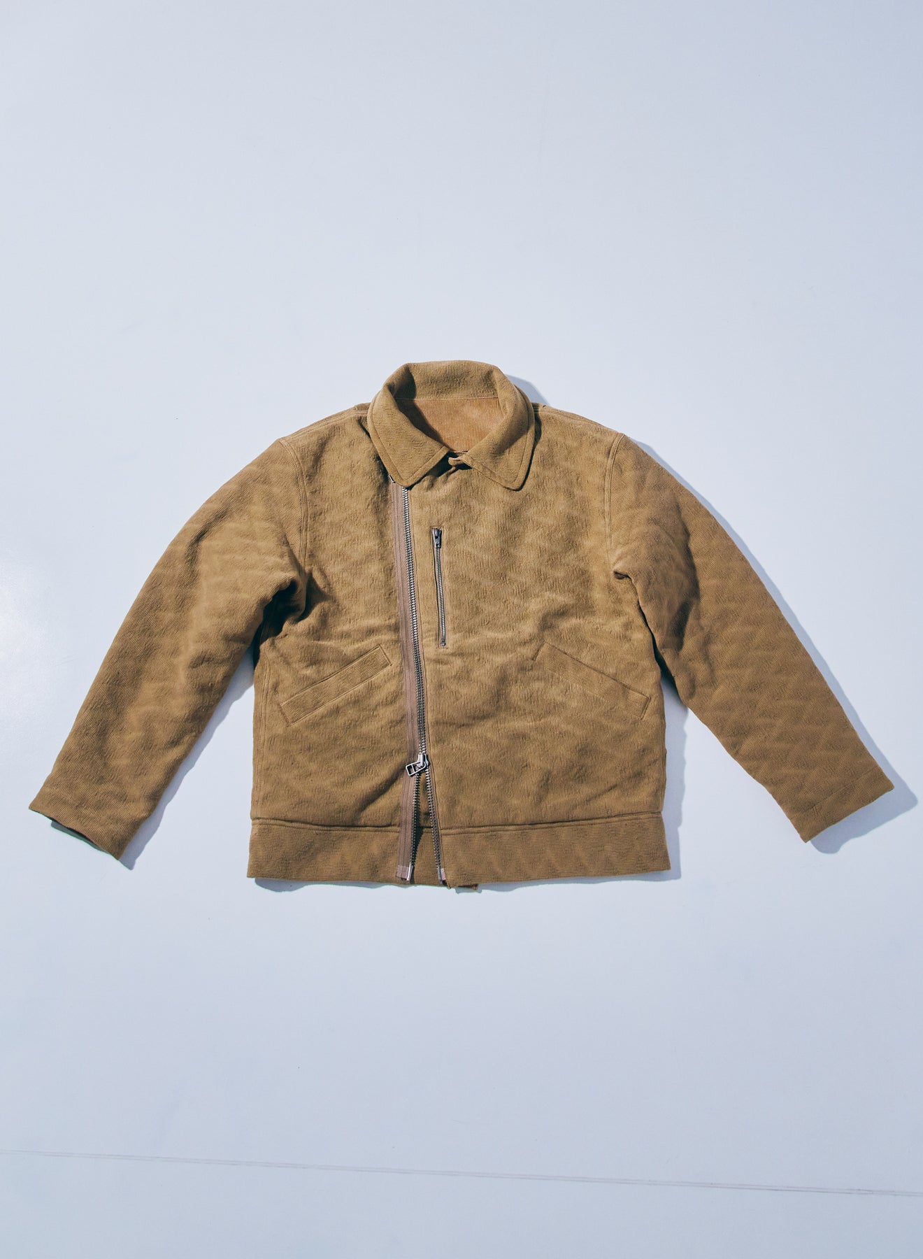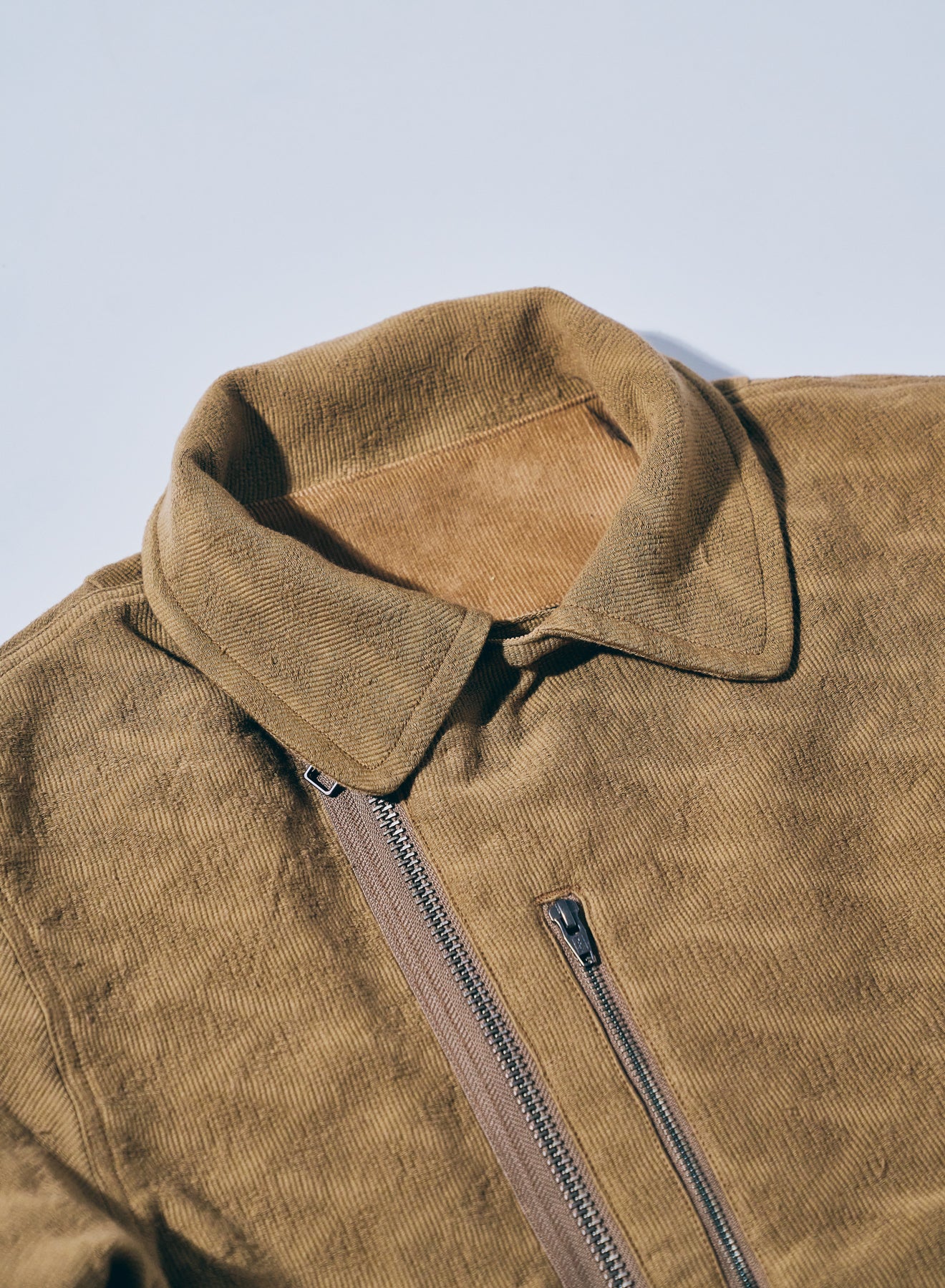 特徴的なディテールを持つショート丈のミリタリ―ジャケットをベースに、同じく特徴的な生地であるジャギーデッキクロスを用いた中綿ジャケット。ジッパーで脱着可能なフードの口には形状記憶素材が入り、また、フード内部にはコーデュロイを配置することで、機能に優れる中綿と相まって、高い保温性を持ちます。また、アームホールはやや太めに設定、肩周りに余裕を持たせた立体的なパターンにより、腕周りの可動域も確保しています。