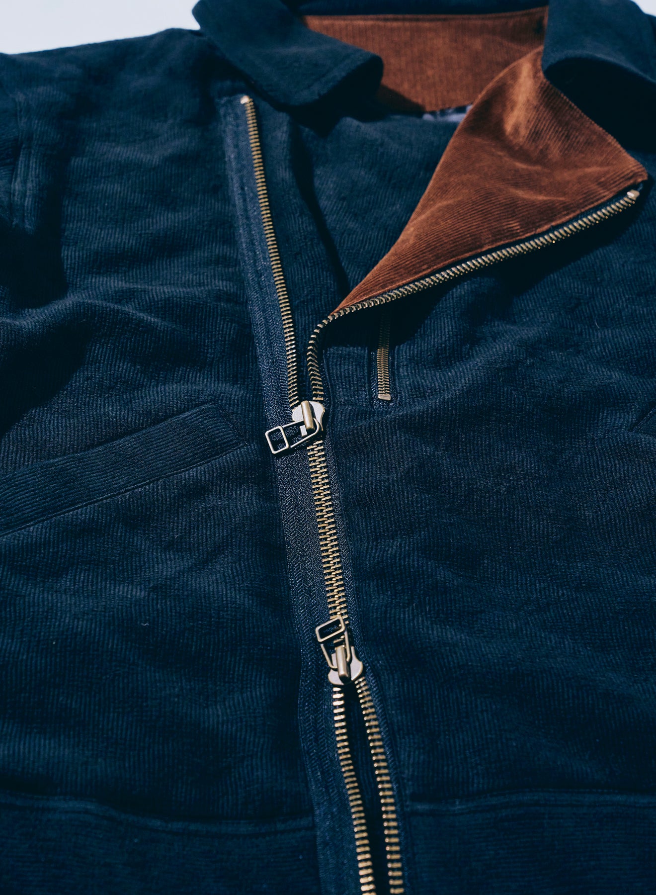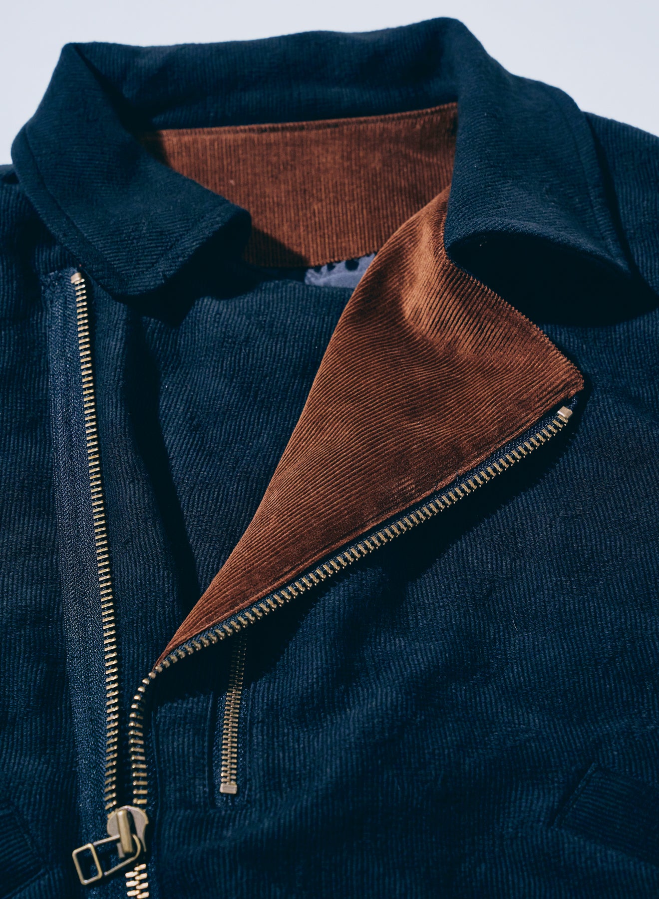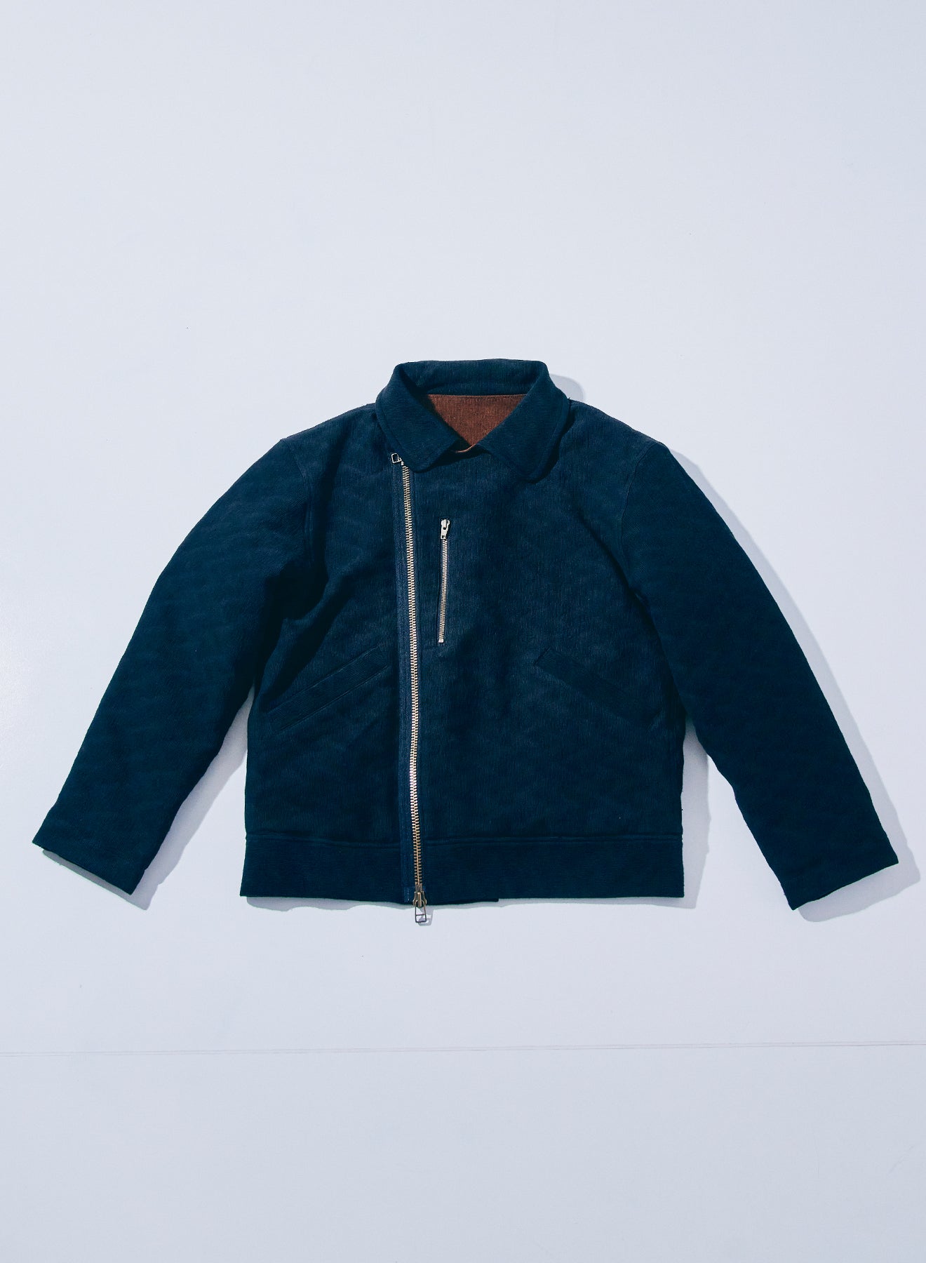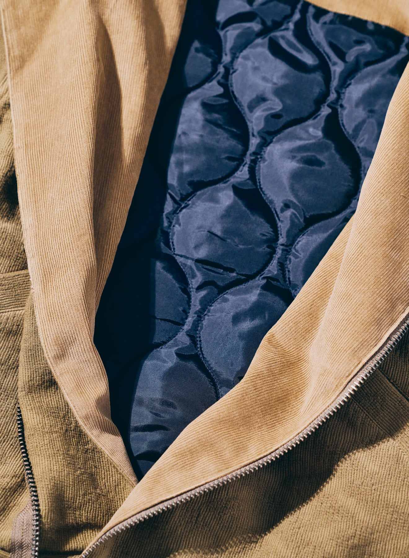 特徴的なディテールを持つショート丈のミリタリ―ジャケットをベースに、同じく特徴的な生地であるジャギーデッキクロスを用いた中綿ジャケット。ジッパーで脱着可能なフードの口には形状記憶素材が入り、また、フード内部にはコーデュロイを配置することで、機能に優れる中綿と相まって、高い保温性を持ちます。また、アームホールはやや太めに設定、肩周りに余裕を持たせた立体的なパターンにより、腕周りの可動域も確保しています。