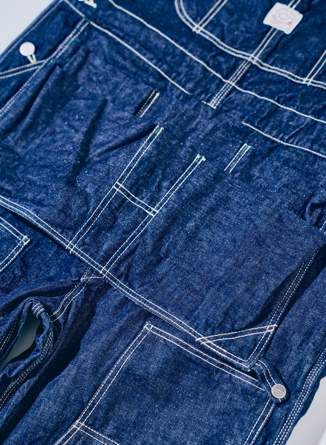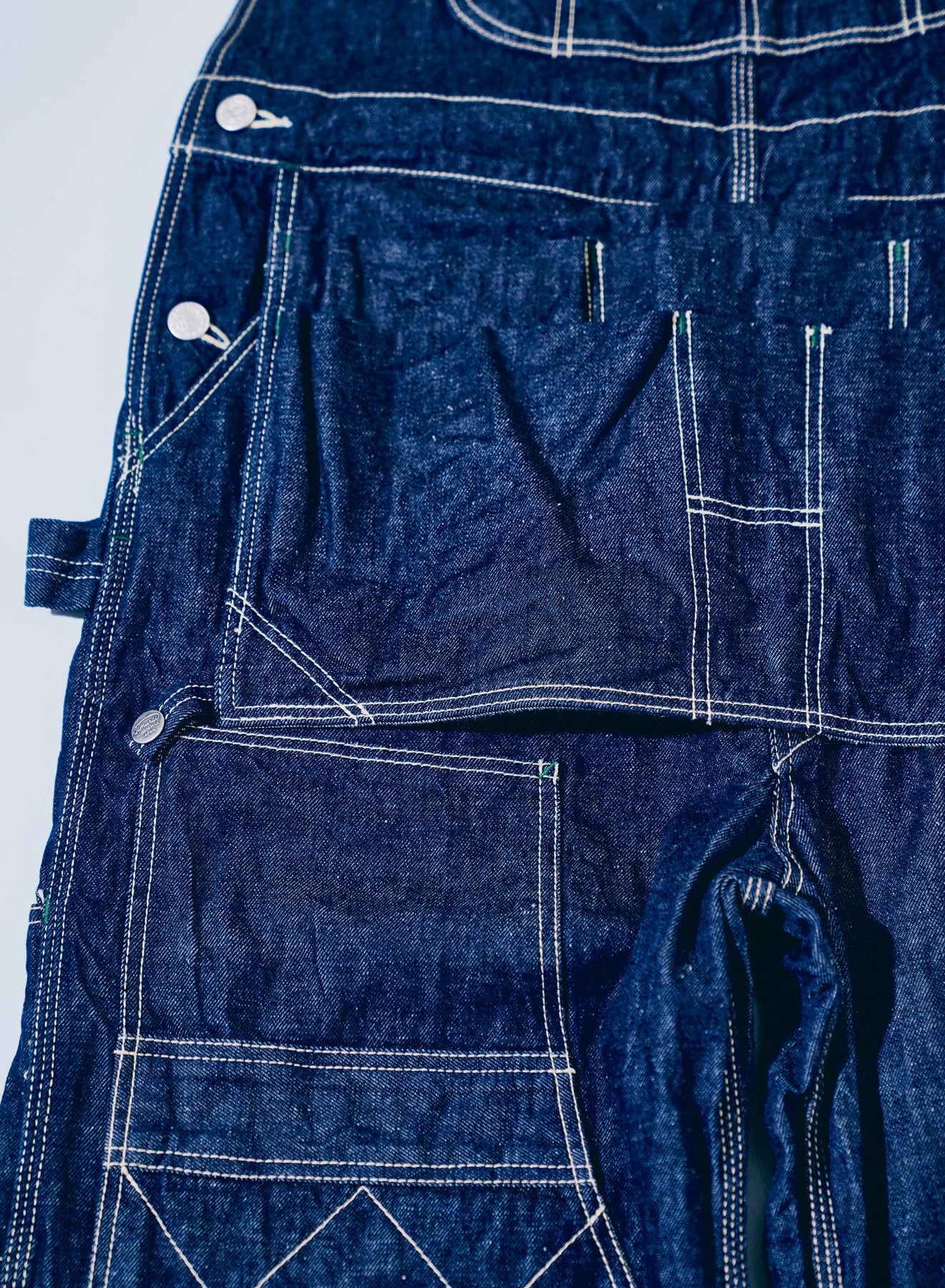サムライコットン10ozセルビッチデニムによるオーバーオールです。40‘sのスタイルを参考に、フロントにエプロンポケット、ダブルニーといったユニークな仕様で、シルエットはオーバーオールらしいドッシリとした太い形になります。縫製はキナリの太い番手中心で巻縫いトリプルステッチなどステッチワークも際立っております。ボタンはサムライコットン製品にのみ付く、コットン柄の純銀鍍金による鉄製ボタン、ポケット袋にはサムライコットン柄のスレーキを採用しています。エプロン部分にはオリジナルスナップボタンも使用しています。