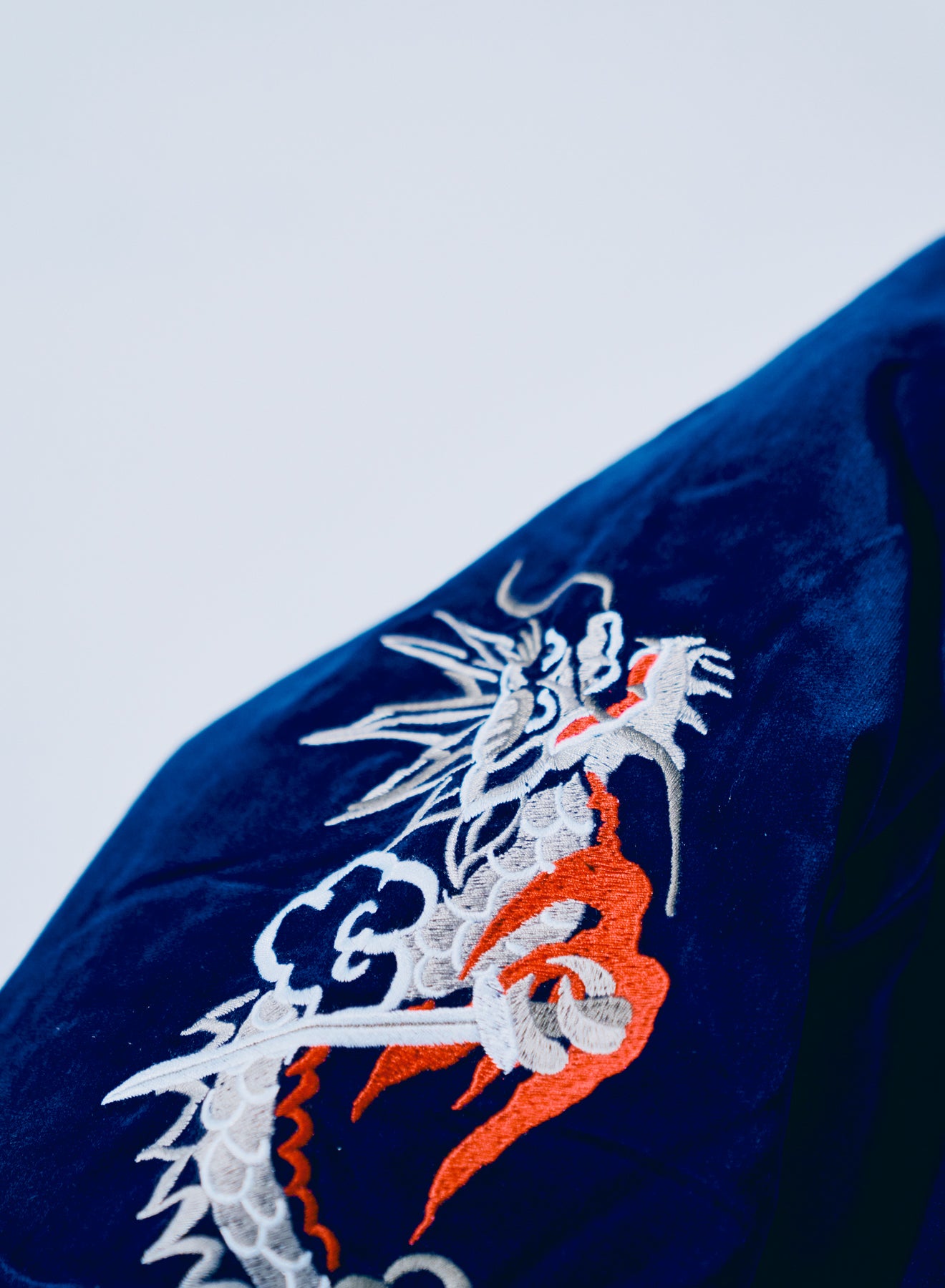 別珍生地によるスカジャンです。生地は綿100%の別珍生地をインディゴカラーに染色したものです。移染を考慮して、色落ちの少ない特殊な方法でインディゴカラーに染め上げました(インディゴ染料ではありません)。裏は黒のサテン地を使用しており、薄めの中綿を入れています。ビンテージでも見られる髑髏を中心とした有名な構図をベースに、兜を被せた髑髏、刀や軍配を持った龍などサムライらしいデザインとなっています。刺繍は実際の手振り刺繍から型を起こしており、非常に雰囲気のある仕上がりになっています。リブパーツも別注で編み立てたものになります。