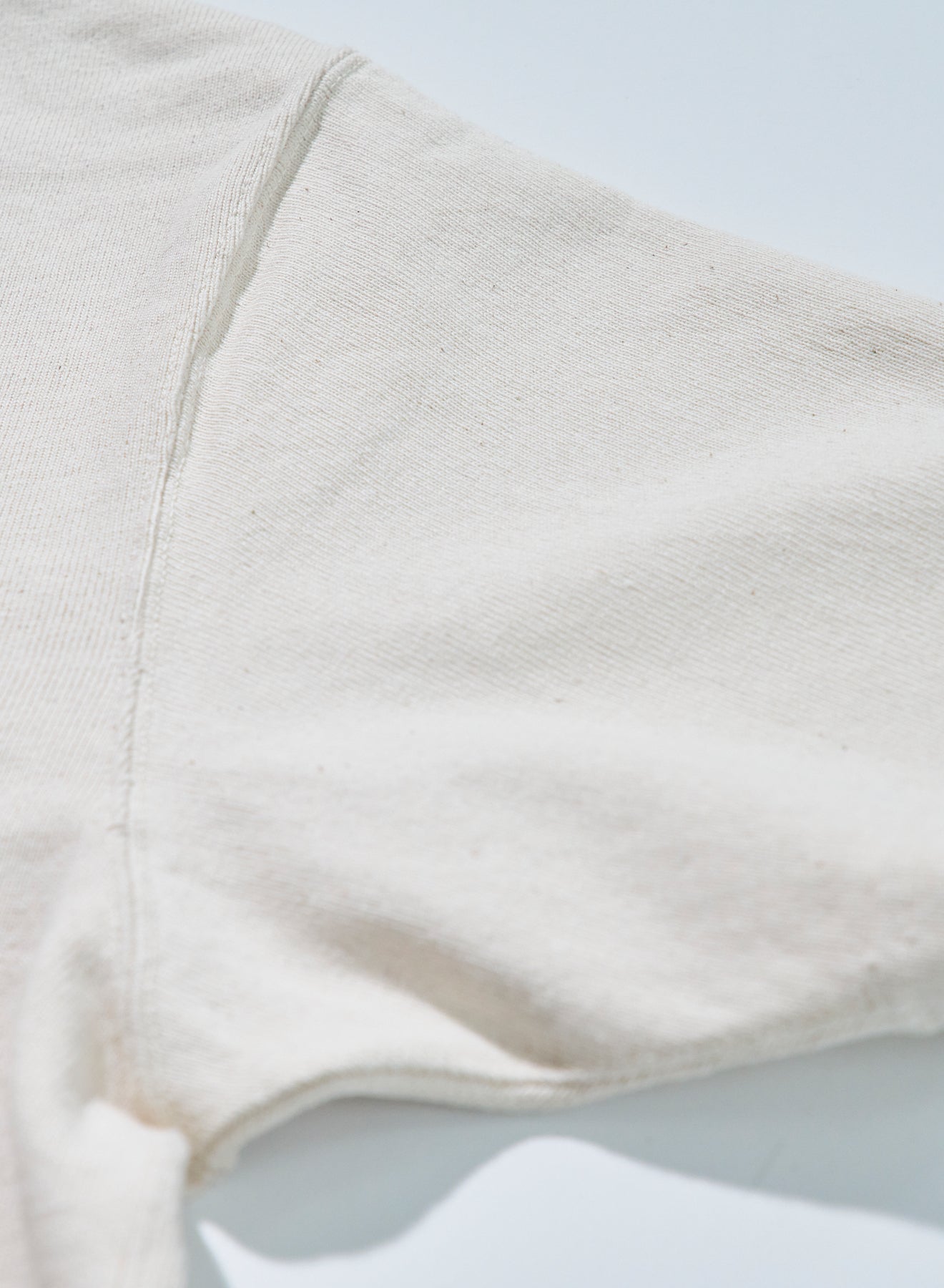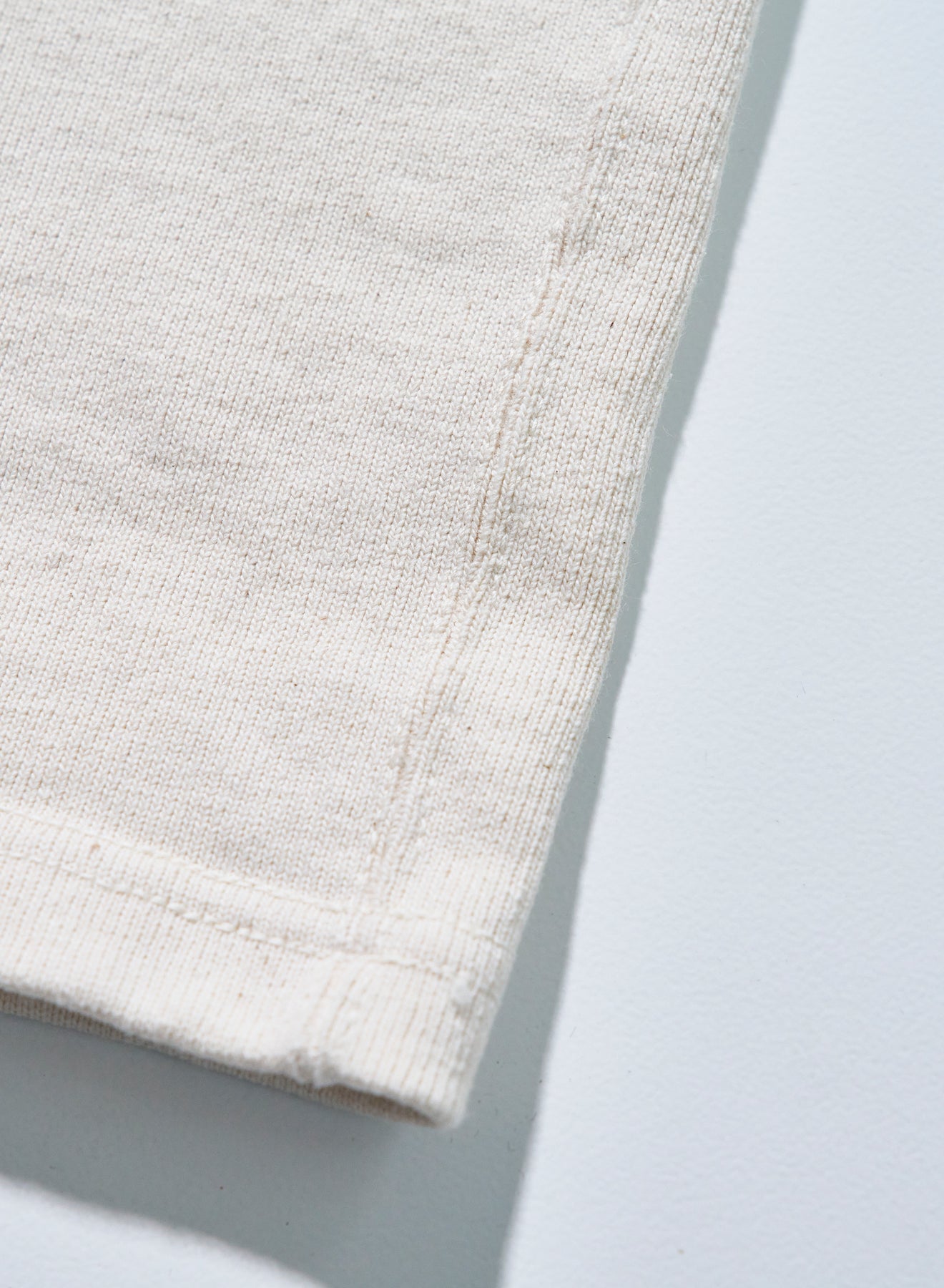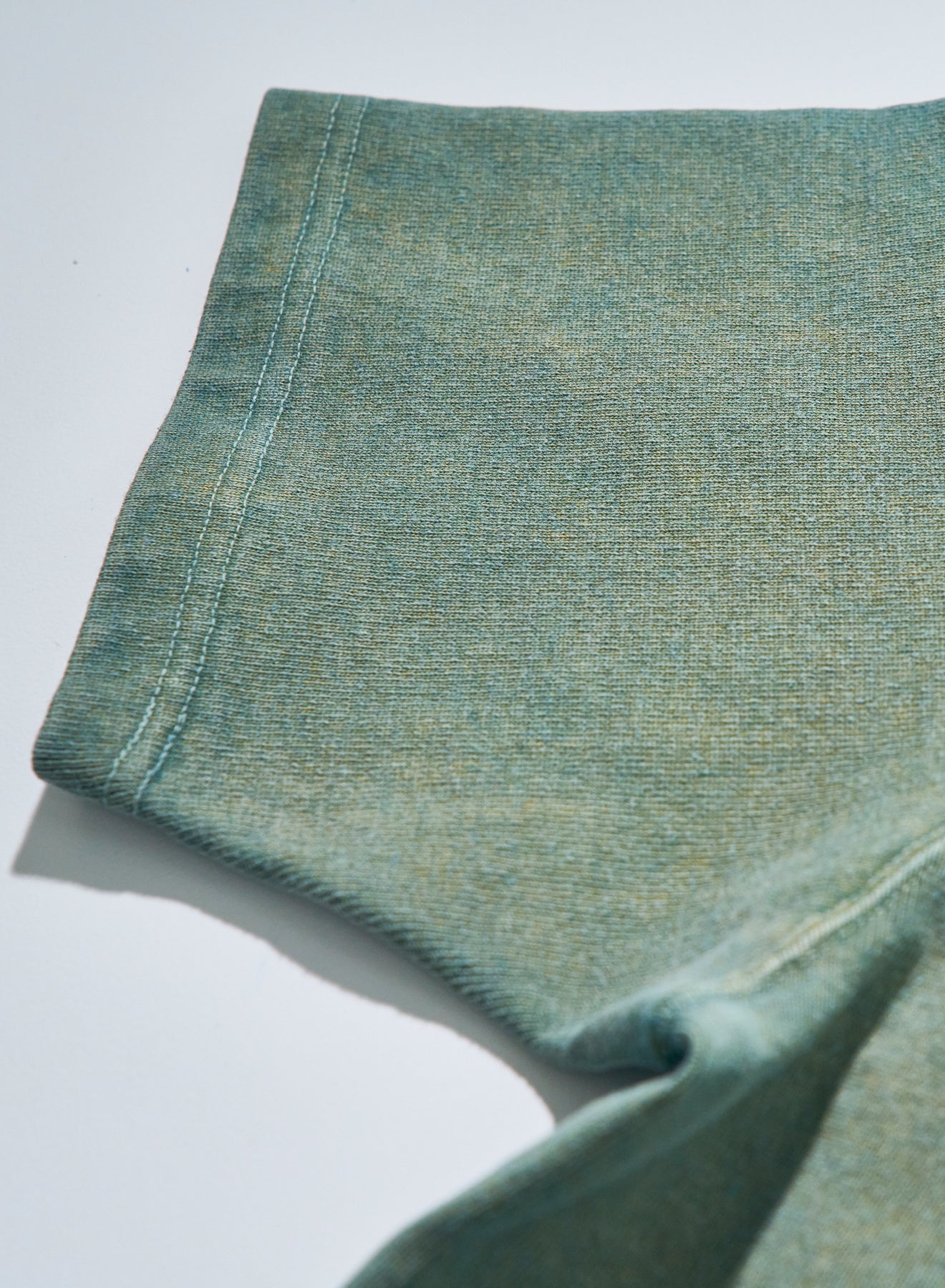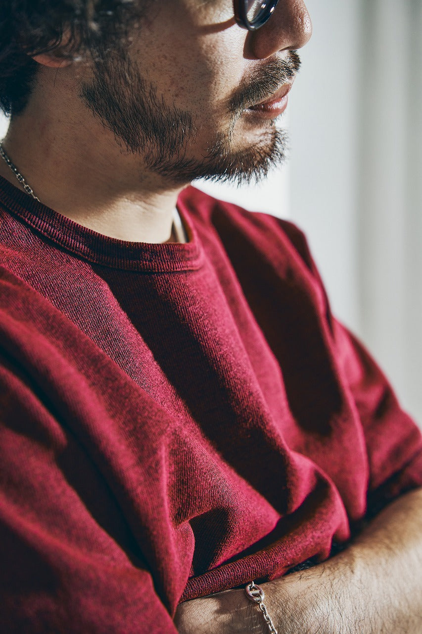 10番手の糸を2本撚り合わせた糸によるエクストラヘビーウエイト天竺シリーズ。オープンエンドヤーンまたは空紡糸と呼ばれる糸を使用しており、これは、空気の力で撚りをかけて紡績された糸です。この紡績縫方法をとることにより、通常は難しい、太い短繊維のみで紡績することができるため、ムラ感のある糸に仕上がり、かつ、その仕上がった糸は適度な空気を含みドライな質感が生まれます。ただでさえ天竺では非常に太番手な部類に入る10番の糸を、さらに双糸、5番相当の糸に仕上げており、そのヘビーオンスデニムを織れるほどの糸で編まれたこの天竺生地はザラザラし非常に丈夫な生地に仕上がっています。また、染色は、異なる性質をもった染料を重ね、見る角度によってその色が変わるよう、染工場と調整を繰り返して完成した手法で、着用によって色味も変化し、"育てる"Tシャツになっています。