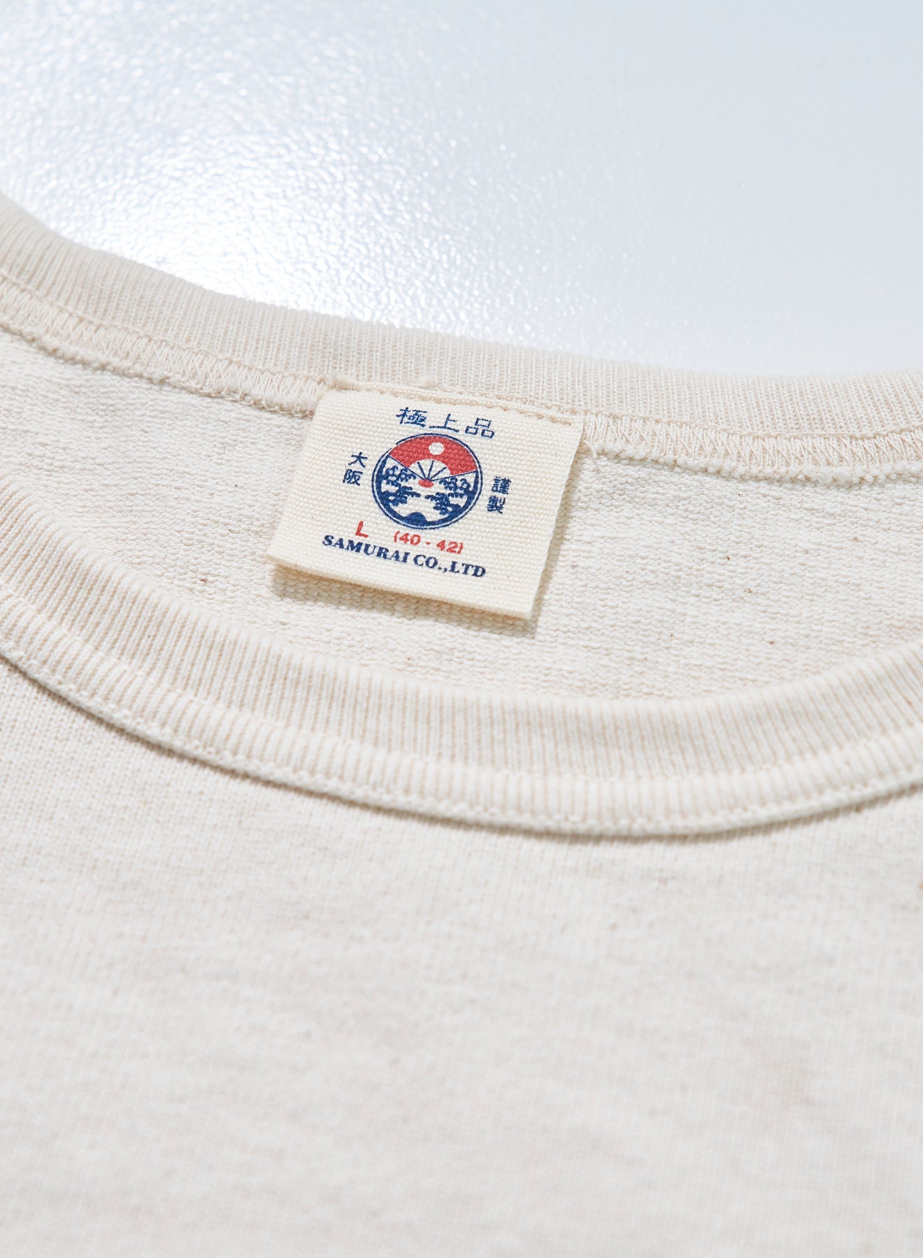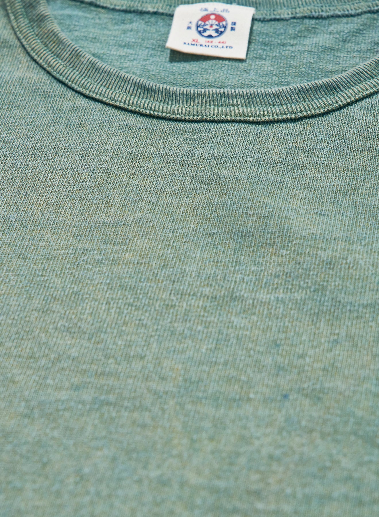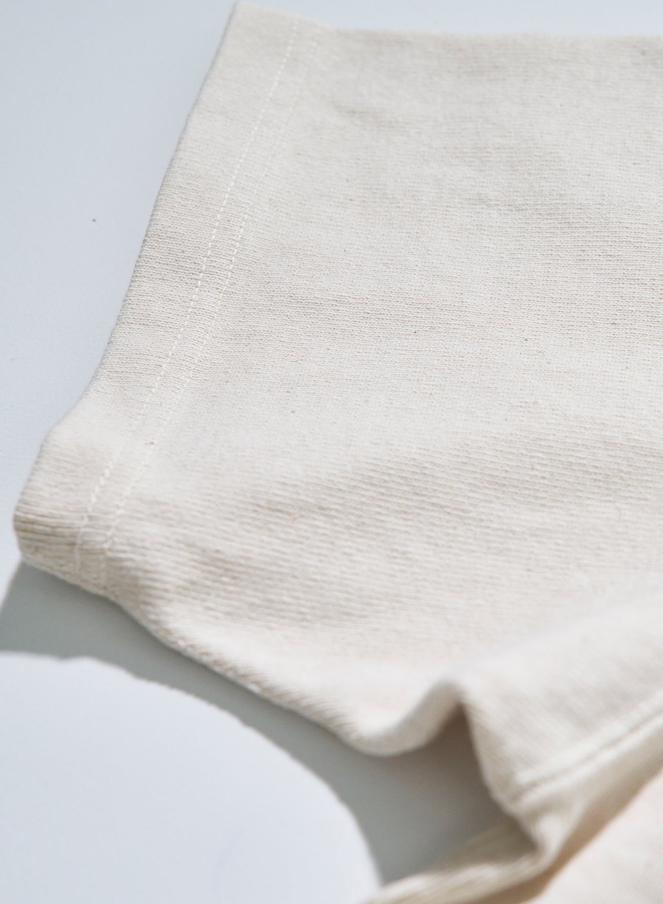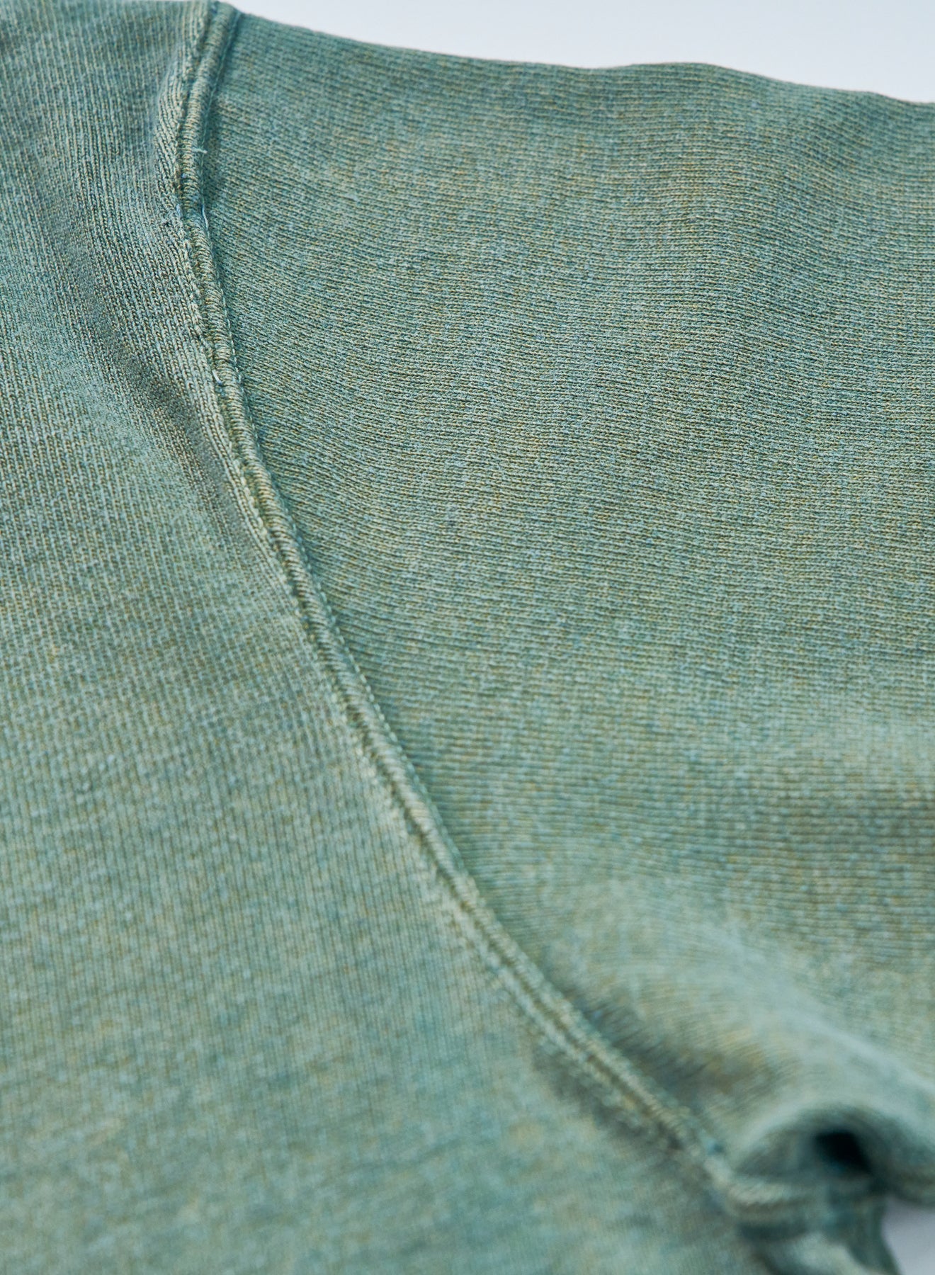10番手の糸を2本撚り合わせた糸によるエクストラヘビーウエイト天竺シリーズ。オープンエンドヤーンまたは空紡糸と呼ばれる糸を使用しており、これは、空気の力で撚りをかけて紡績された糸です。この紡績縫方法をとることにより、通常は難しい、太い短繊維のみで紡績することができるため、ムラ感のある糸に仕上がり、かつ、その仕上がった糸は適度な空気を含みドライな質感が生まれます。ただでさえ天竺では非常に太番手な部類に入る10番の糸を、さらに双糸、5番相当の糸に仕上げており、そのヘビーオンスデニムを織れるほどの糸で編まれたこの天竺生地はザラザラし非常に丈夫な生地に仕上がっています。また、染色は、異なる性質をもった染料を重ね、見る角度によってその色が変わるよう、染工場と調整を繰り返して完成した手法で、着用によって色味も変化し、"育てる"Tシャツになっています。