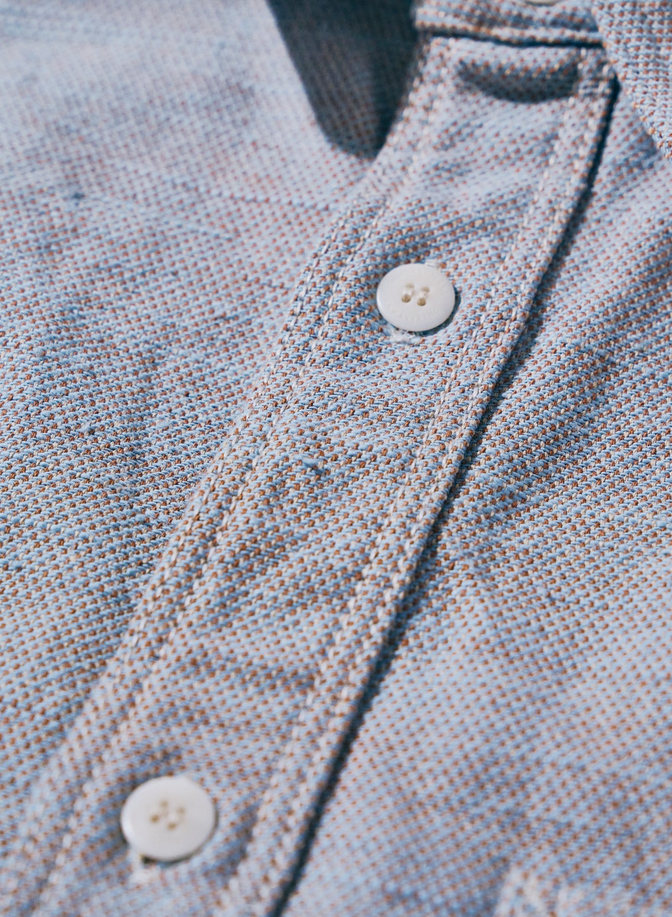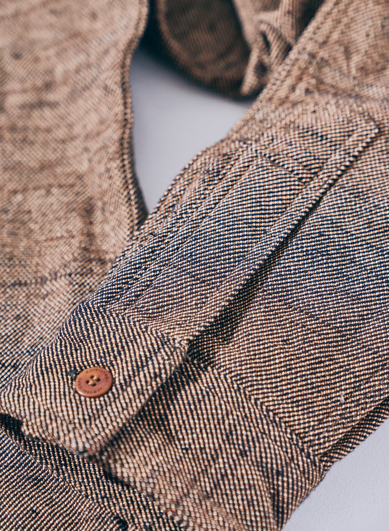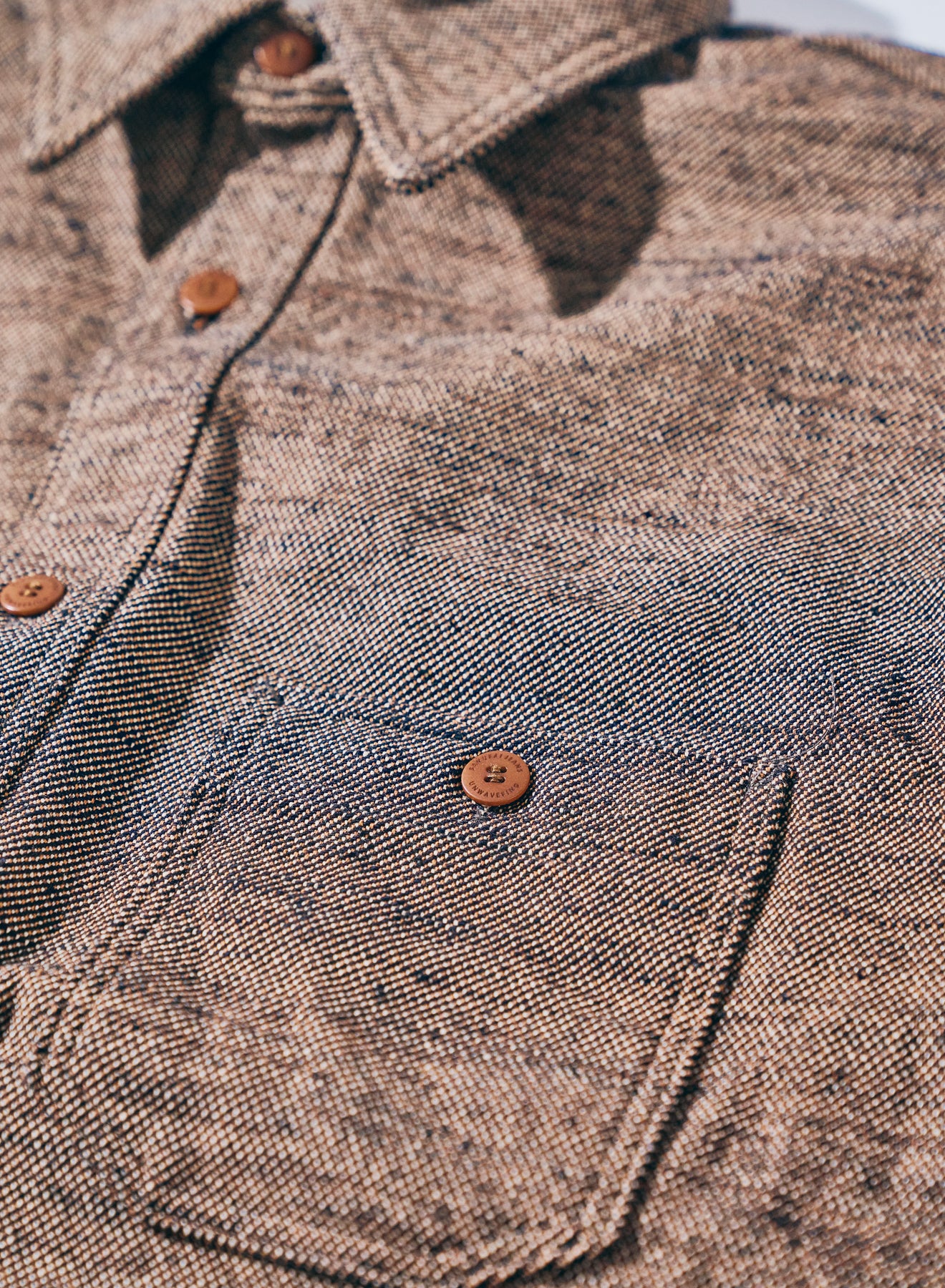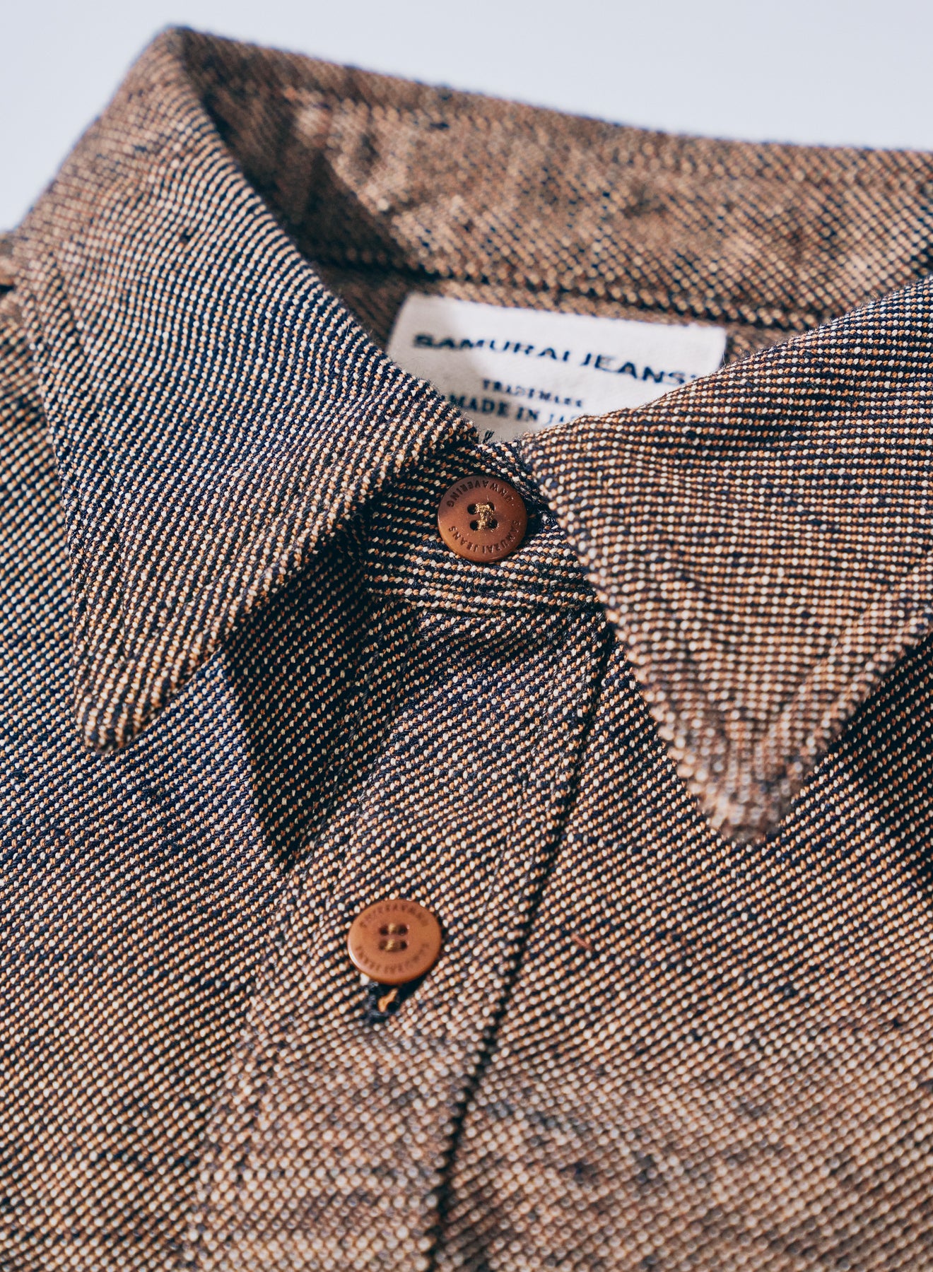 先染め織物の産地である新潟県で織られた無地フランネル生地によるシャツ。シャツはワークの要素を取り入れたデザインで、フラップの無い左右対称のポケット、肘当てが付きます。ボタンはサムライ刻印入りのナットボタンの白色と茶色を使用、縫製はトリプルステッチ巻縫い中心の堅牢な仕様となっています。