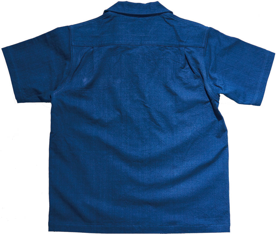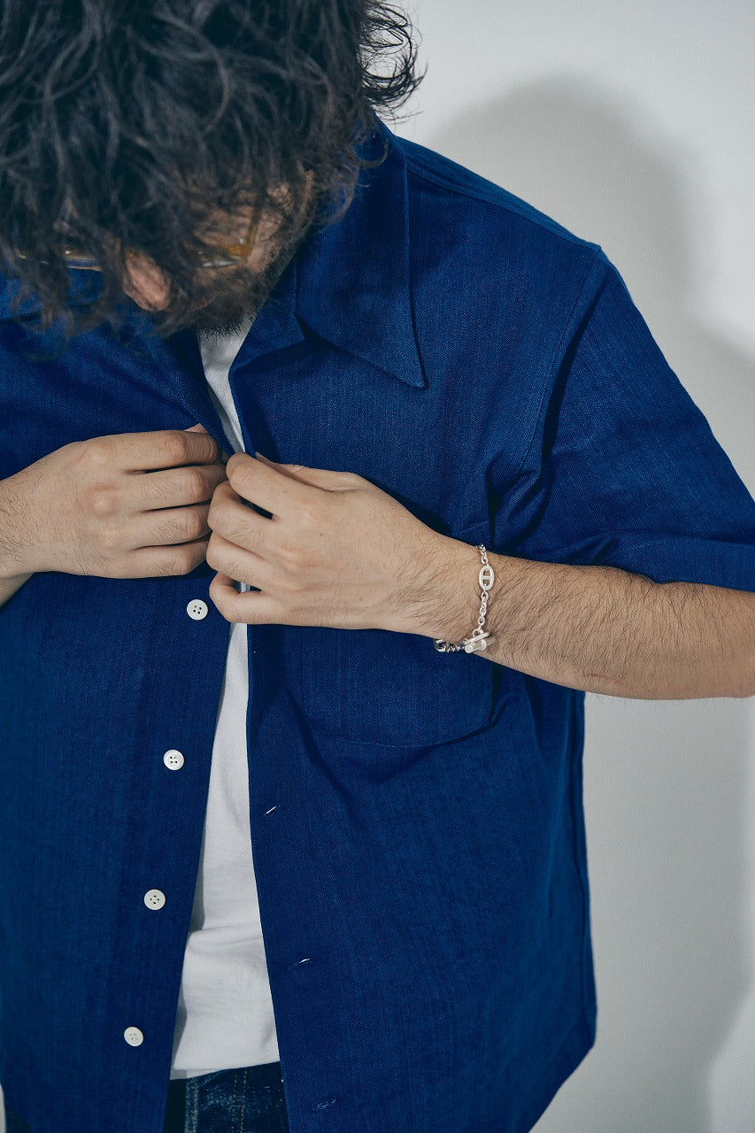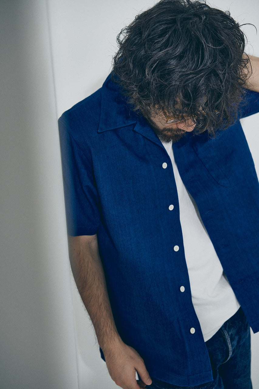 美しい淡い藍の染料をまとったへリンボンツイル生地。藍を用いた染料を使い、枷染めにて染色、同社で織布まで行っております。手染めで行われる、枷染め。染料の入った甕に枷状になった糸をくぐらせ、染め重ね、糸色を濃く変化させていく方法で、その日の気温や温度に左右される染料のコンディションをコントロールしながら、それは行われます。また、糸の状態で染め、織布を行っているため、製品染めの藍製品よりも色の堅牢度も高く、長く、じっくりと藍の生地を楽しんでいただけます。藍浅葱へリンボンツイル生地による半袖オープンカラーシャツ。身幅と袖にゆとりを持たせたパターンを採用、ワンポイントのみのデザインとしています。