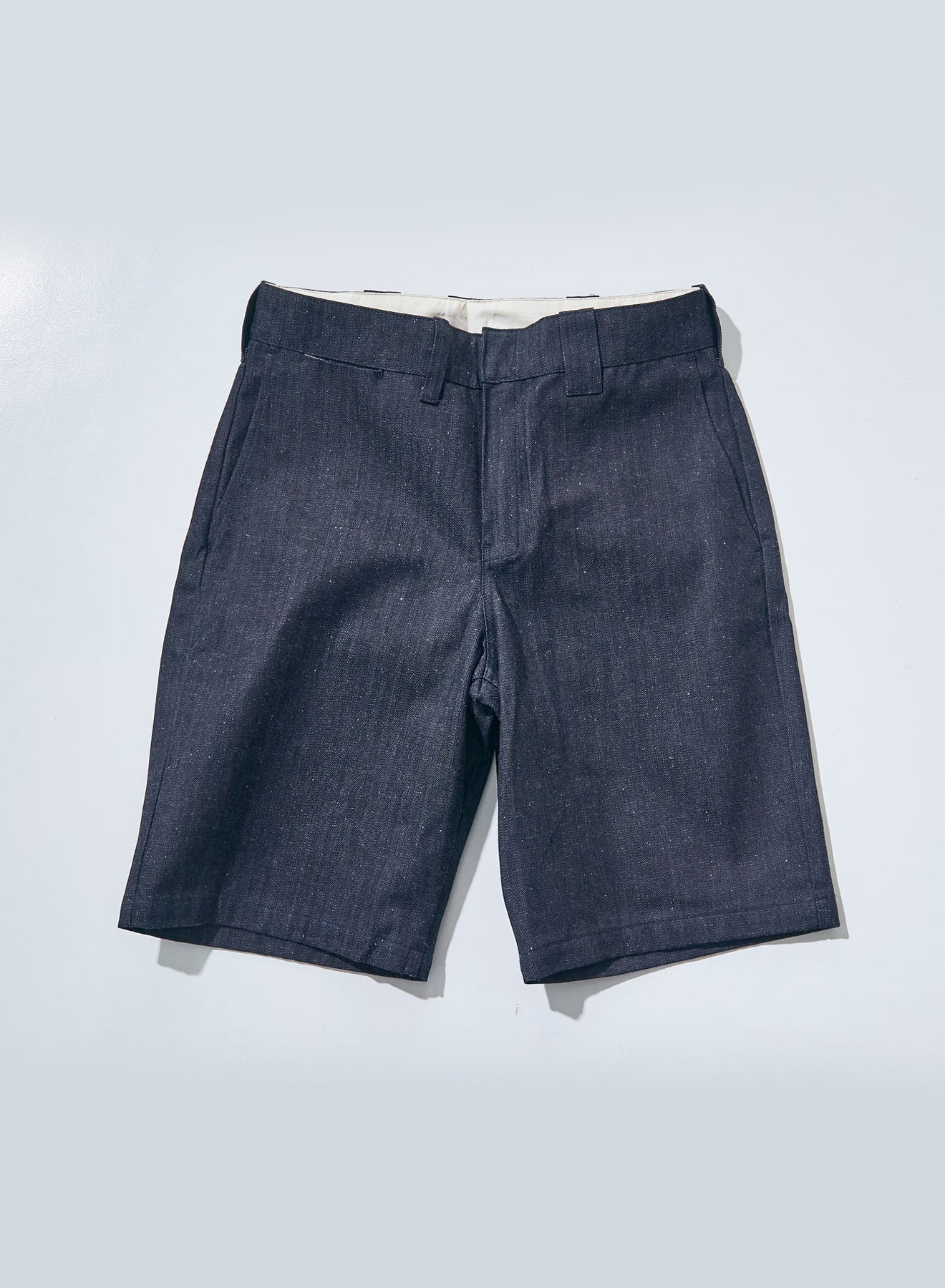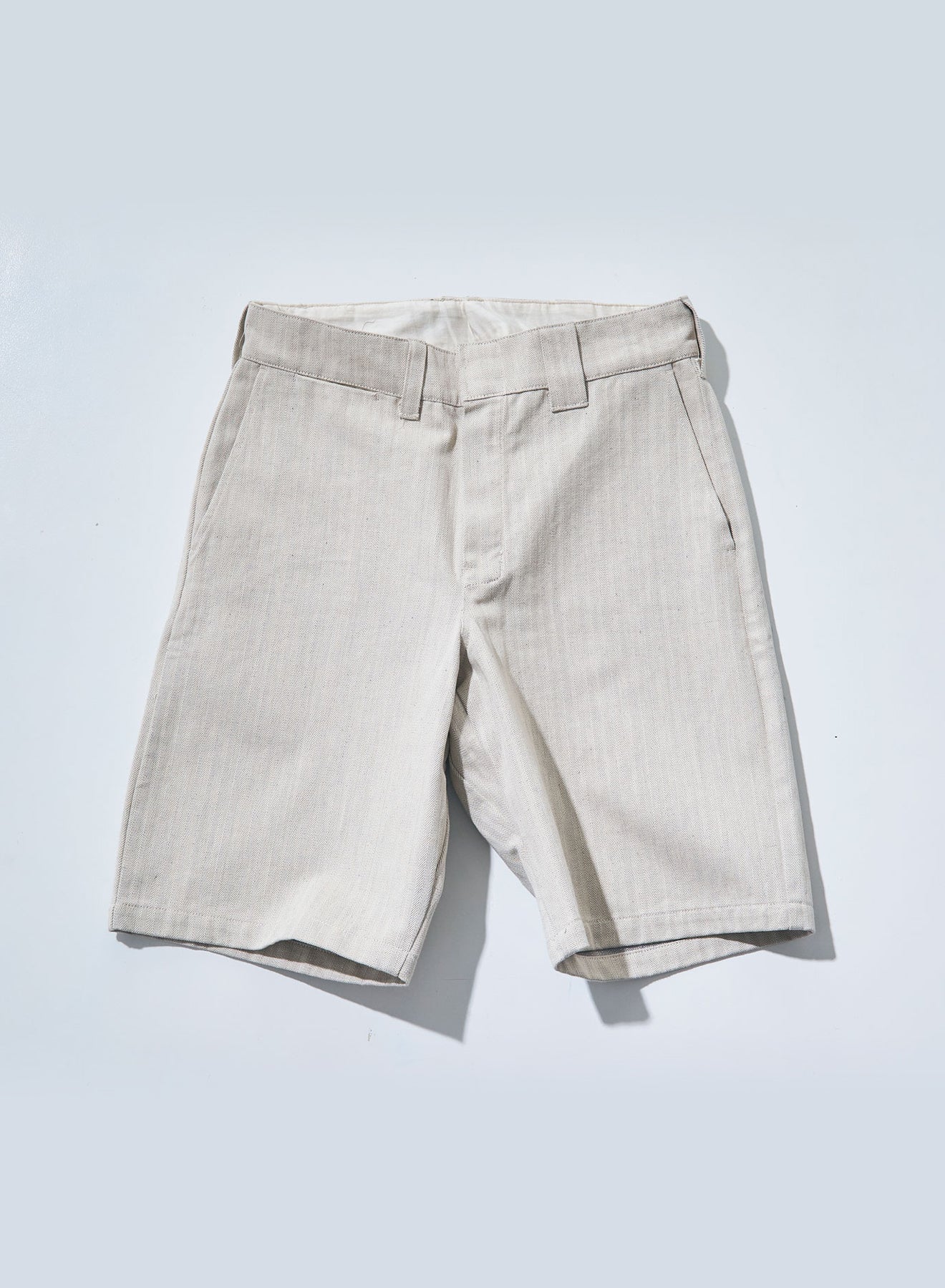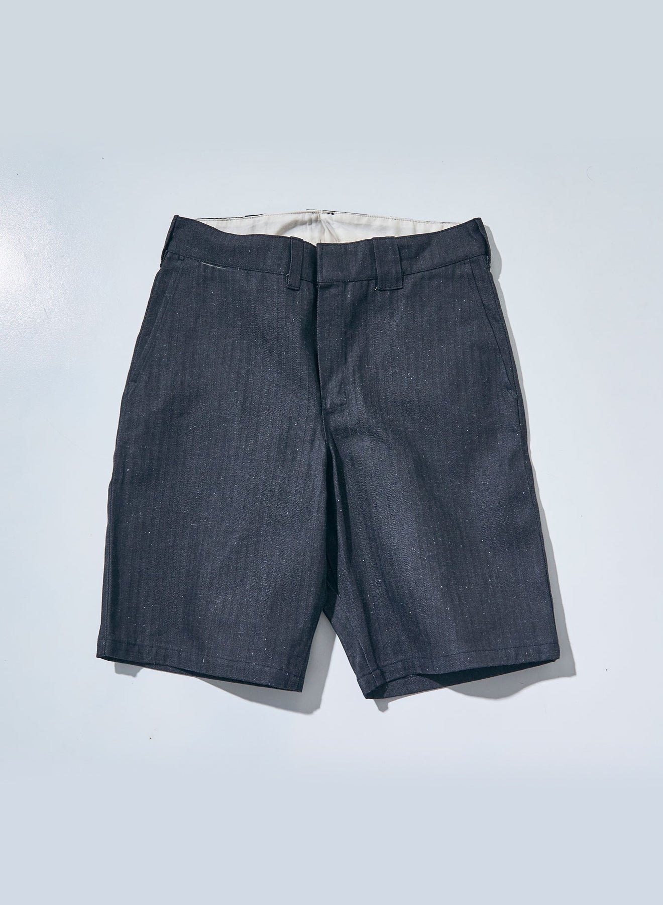 オリジナルヘリンボーンデニムによるショートパンツです。生地は、緯糸にグレー糸を使用したインディゴ・ブラック・オートミールの 13ozSWCオリジナルヘリンボーンデニム3色になります。緯にグレーに染めたネップ糸を織り込んでいるので、縦糸の色味と相俟って非常に雰囲気の良い生地に仕上がっています。インディゴは色落ちする事によって左綾が際立ち、たて筋が目立つとストライプ調になり特有のエイジングを楽しめます。ブラックは硫化染料によるロープ染色なので激しい色落ちが期待できます。