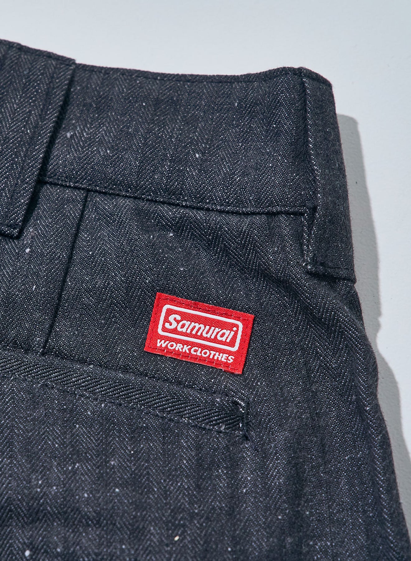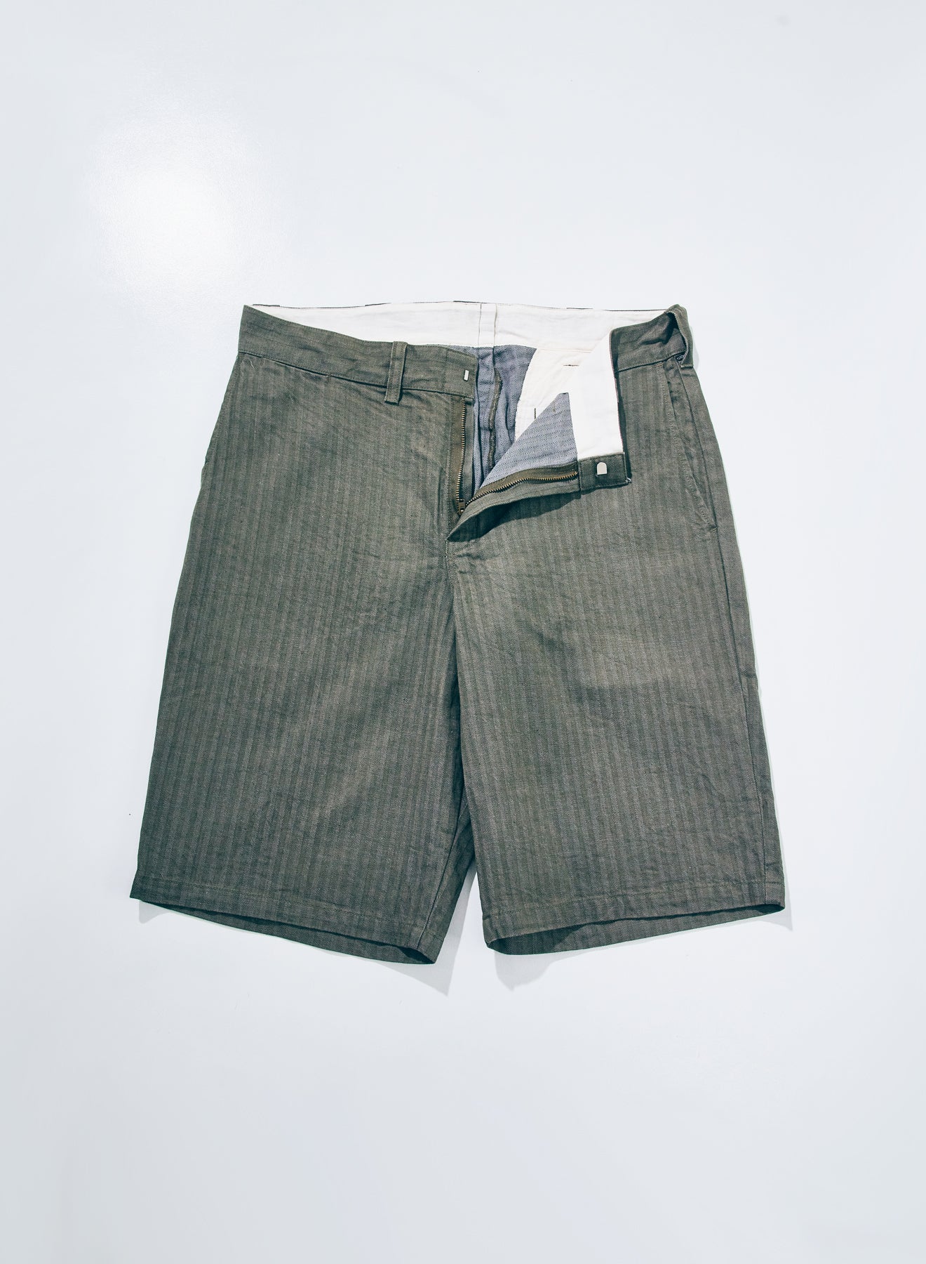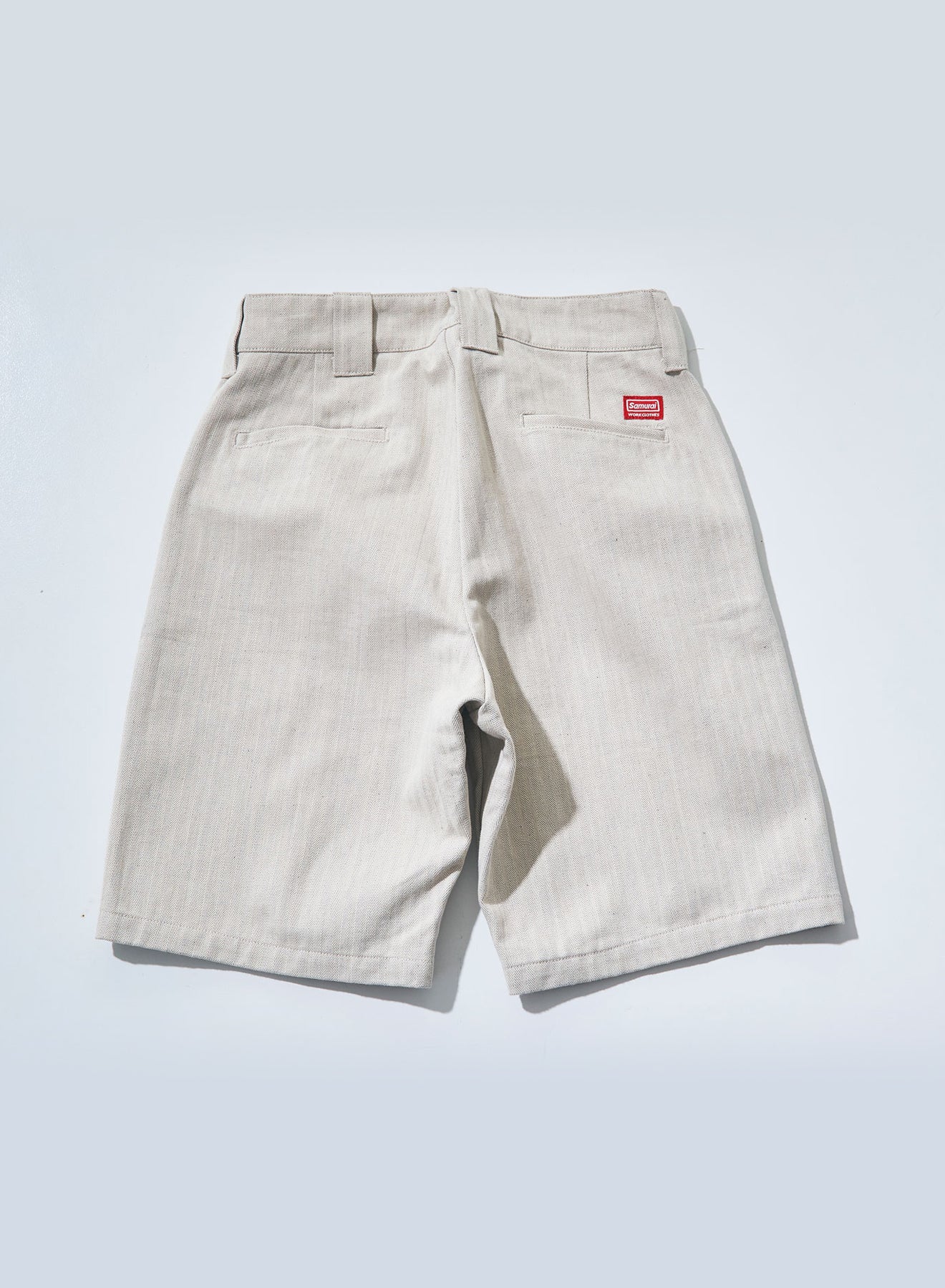 オリジナルヘリンボーンデニムによるショートパンツです。生地は、緯糸にグレー糸を使用したインディゴ・ブラック・オートミールの 13ozSWCオリジナルヘリンボーンデニム3色になります。緯にグレーに染めたネップ糸を織り込んでいるので、縦糸の色味と相俟って非常に雰囲気の良い生地に仕上がっています。インディゴは色落ちする事によって左綾が際立ち、たて筋が目立つとストライプ調になり特有のエイジングを楽しめます。ブラックは硫化染料によるロープ染色なので激しい色落ちが期待できます。