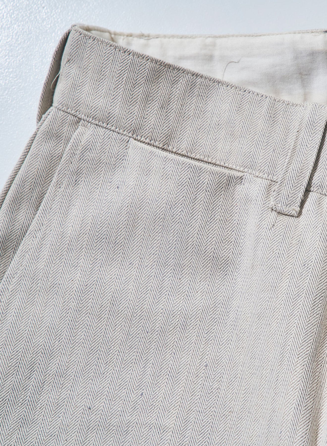 股下は穿きやすさと稼働域を広くする為にダイヤマチを付け、前身頃右前ベルトループのみ巾を細くして、ウォレットチェーンや懐中時計のフックをつけやすくしています。右前にはウォッチポケットが付きます。前ポケットはコイン等を入れる場合等、劣化が早いスレーキ袋底に生地を二重に当て強度を上げています。トップはホック仕様にしています。また後中心でウエストを微調整できる仕様(ウエスト出し約1インチ)になっており、幅広く着用頂けます。穿きやすいシルエットです。