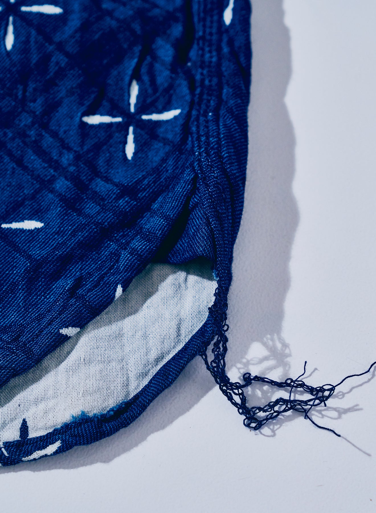 This work shirt is made of a "narihirabishi" goldfish pattern jacquard fabric. The fabric is a special double weave, combining the dark color of rope indigo with white yarn and the lighter color of rope indigo with white yarn. The water chestnut and goldfish patterns are made of dark-colored threads, and as the shirt is worn, the colors fade and the patterns gradually come to the surface. The base is a work shirt with a flap, nut buttons, and robust triple stitching.