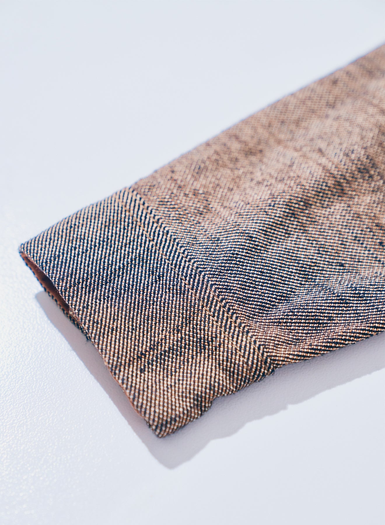 A flight jacket made of Elemental flannel fabric woven in Niigata Prefecture, a production center for yarn-dyed fabrics. Flannel fabrics woven in this region are characterized by their thickness, softness, and texture due to the different backgrounds of the yarns used, the dyeing, and the weaving. The warp and weft yarns are made of very thick yarns that are used for heavy-weight denim while the warp is twinned to increase its strength, and slub yarn is used for the weft to give the fabric a rough texture. In addition, the woven fabric is lightly brushed to give it the look of wool serge, even though it is made of cotton.