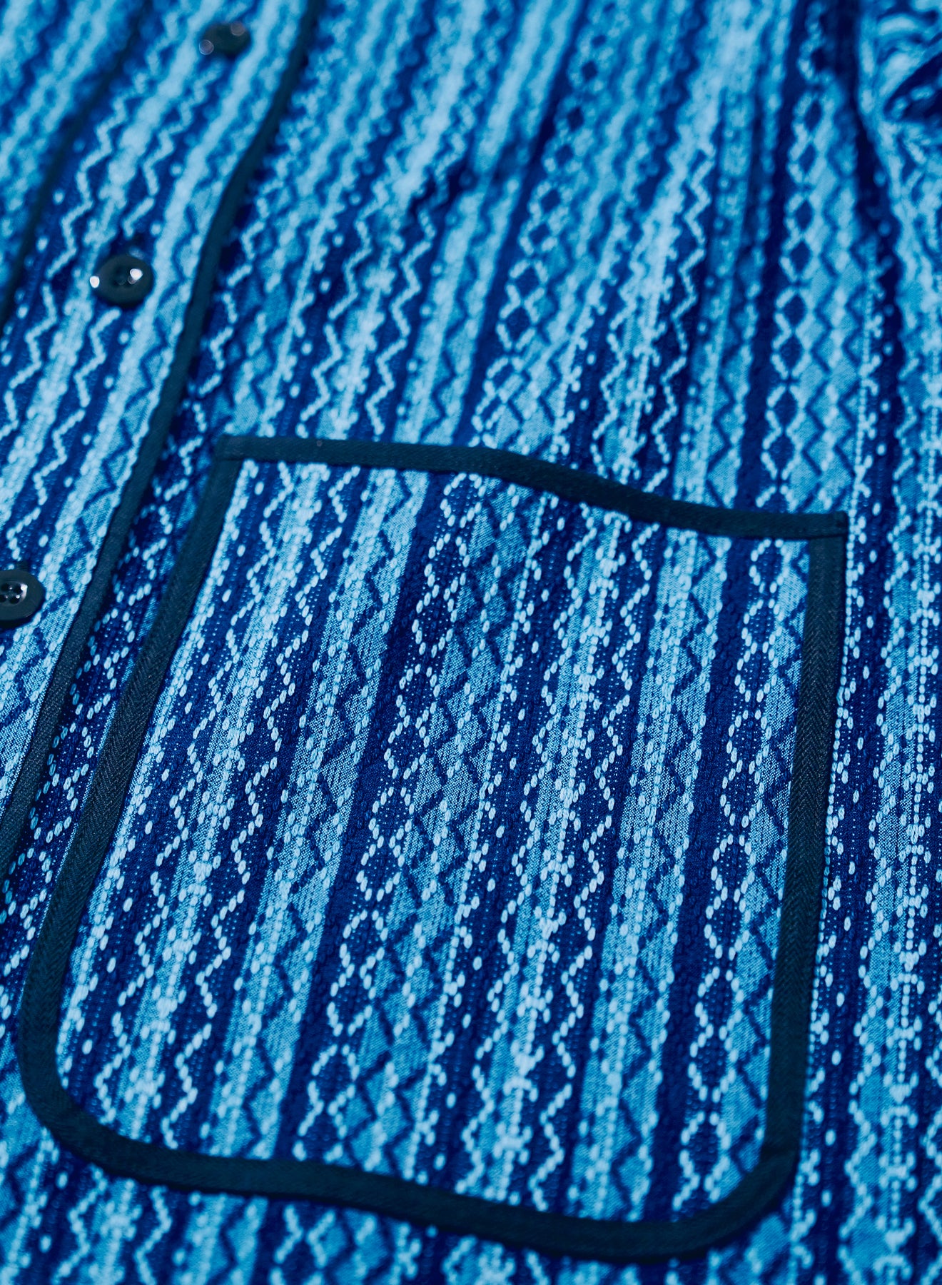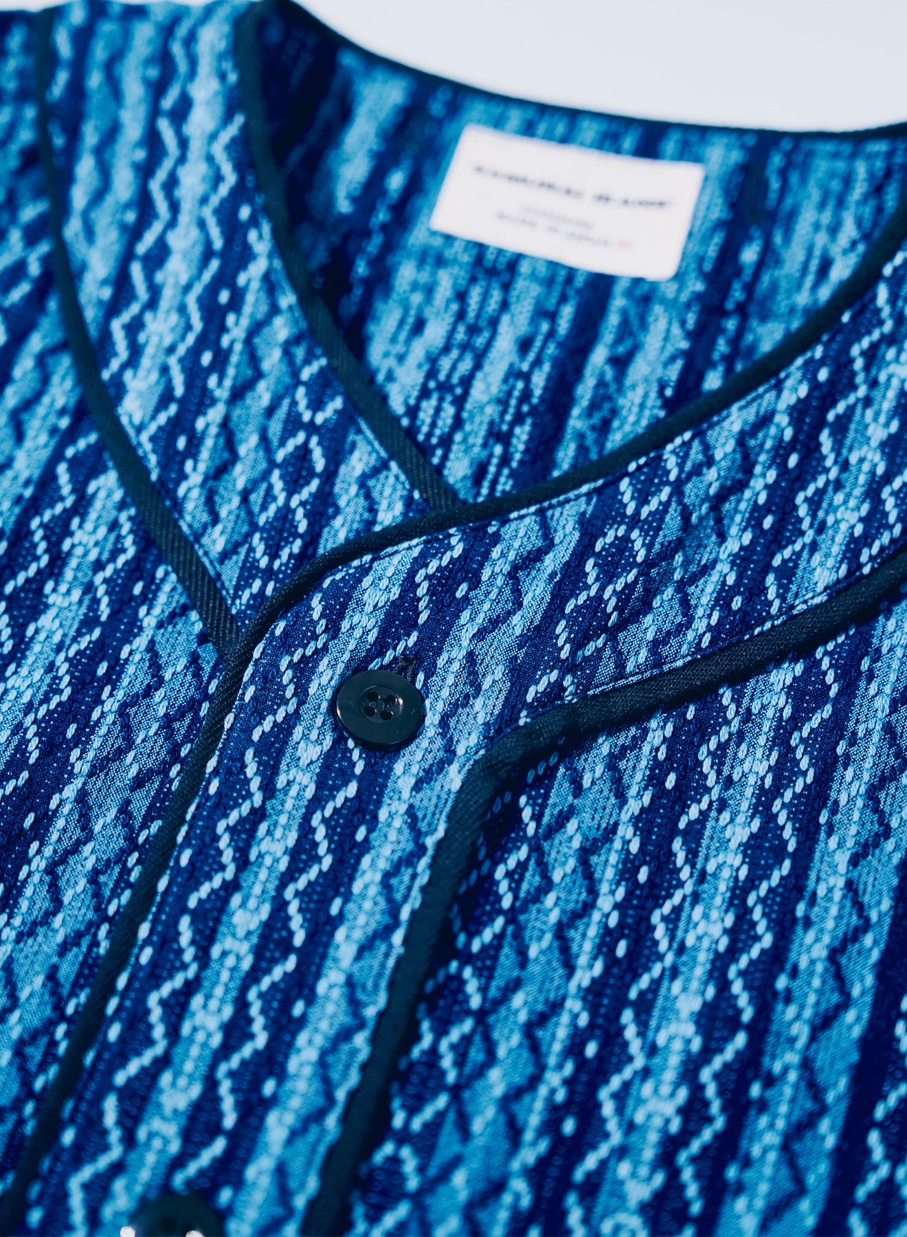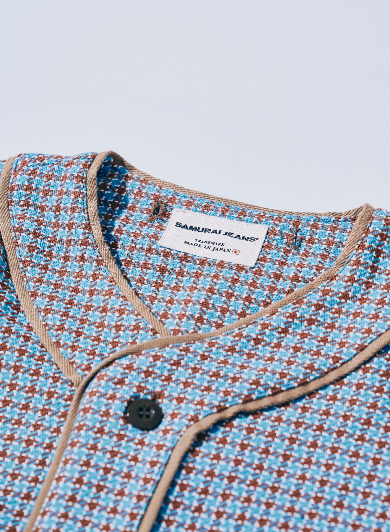 Baseball shirt that can be attached as a liner to the SJCJK25-SP/SJCJK25-YR released in the same season. The overall pattern is slightly roomy, and the hand-dyed stripe fabric mixes natural and synthetic indigo to create a characteristic pattern by interweaving two different colors of stitching in a stripe pattern that is simple but distinctive. The light blue/brown fabric is a heavy flannel with indigo yarn constructed in a 2/2 twill weave. This light blue, dyed indigo to the core, and the brown, dyed by a special reactive dyeing process, slowly fades and turns into a deeply tasteful color.