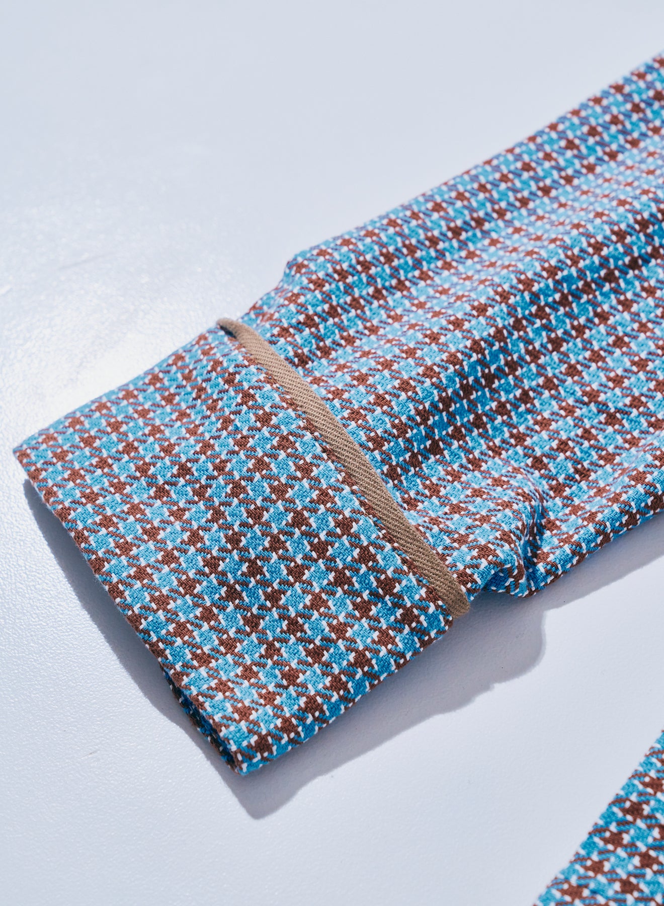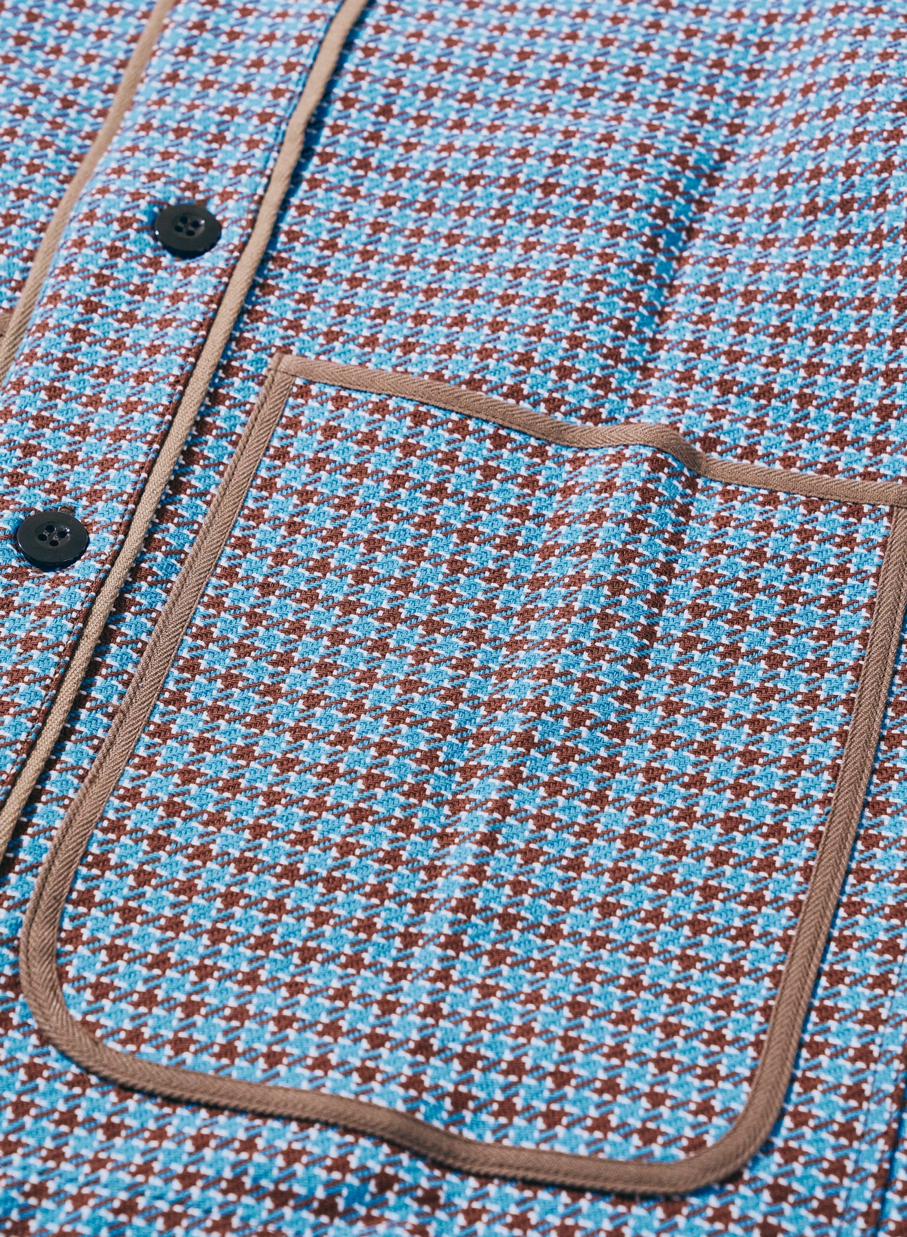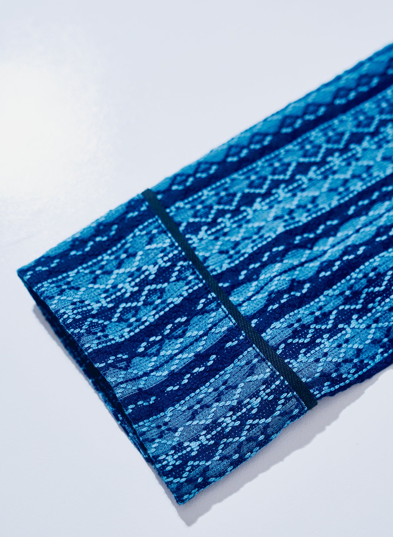 Baseball shirt that can be attached as a liner to the SJCJK25-SP/SJCJK25-YR released in the same season. The overall pattern is slightly roomy, and the hand-dyed stripe fabric mixes natural and synthetic indigo to create a characteristic pattern by interweaving two different colors of stitching in a stripe pattern that is simple but distinctive. The light blue/brown fabric is a heavy flannel with indigo yarn constructed in a 2/2 twill weave. This light blue, dyed indigo to the core, and the brown, dyed by a special reactive dyeing process, slowly fades and turns into a deeply tasteful color.