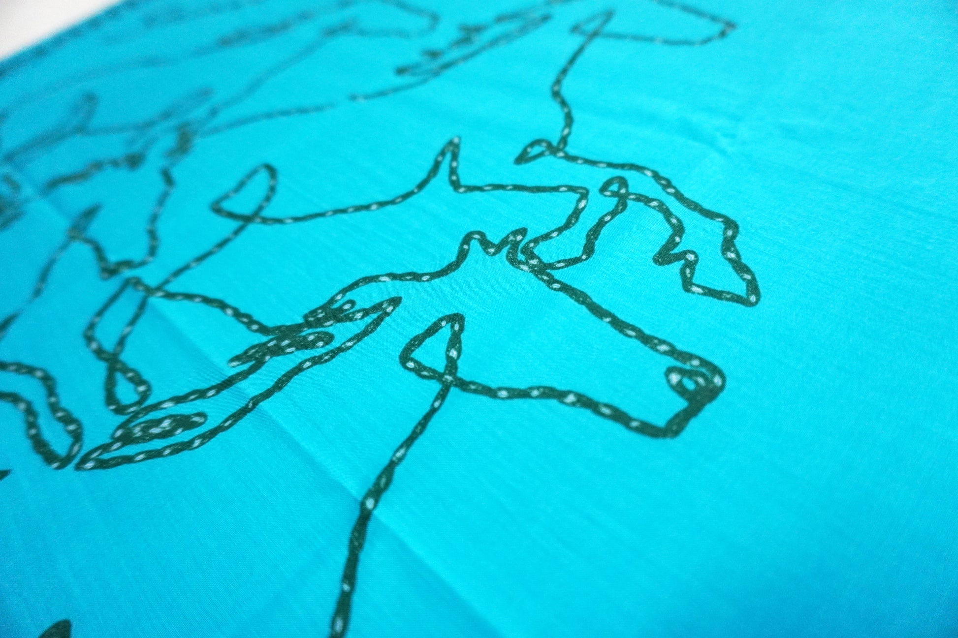 A bandana featuring the horse—an animal traditionally regarded as a symbol of good fortune, often associated with phrases like “things go well” and “luck comes running in.” The silhouette of the horse is expressed in a chain-stitch style, complemented by matching chain-stitch detailing along all edges for a unique and cohesive design. Versatile and functional, this item can be used not only as a bandana, but also as a scarf or even a furoshiki wrapping cloth.