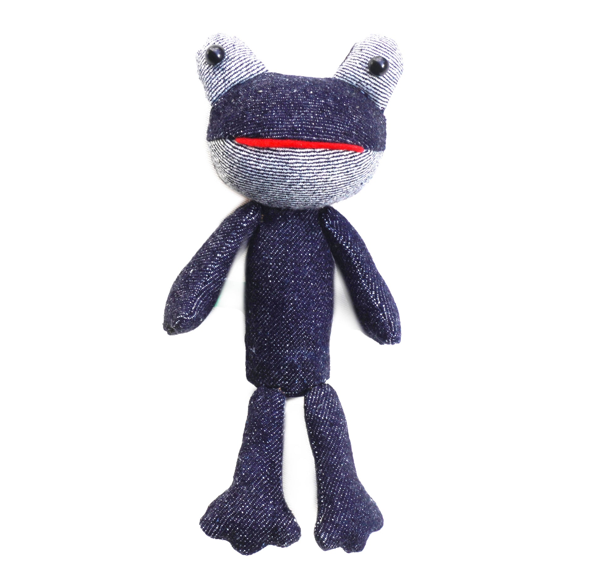 This frog doll is made of Samurai's original denim fabric, and is a one-of-a-kind handmade product with a different expression on each one. In addition to the back and carabiner, the doll has magnets on its hips, so it can be displayed sitting up. The back and carabiner can be used to hang it on your bag or as an interior decoration in your car.
