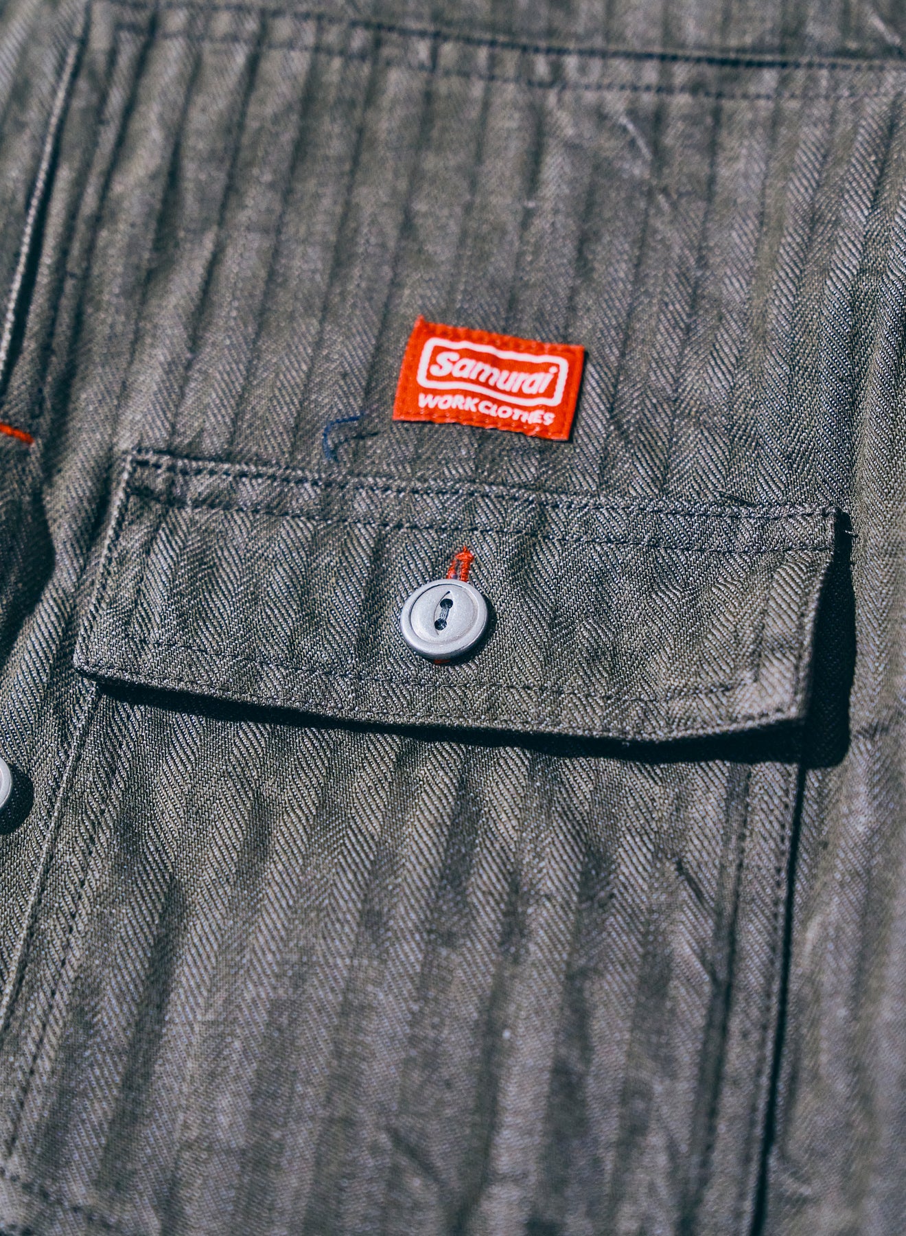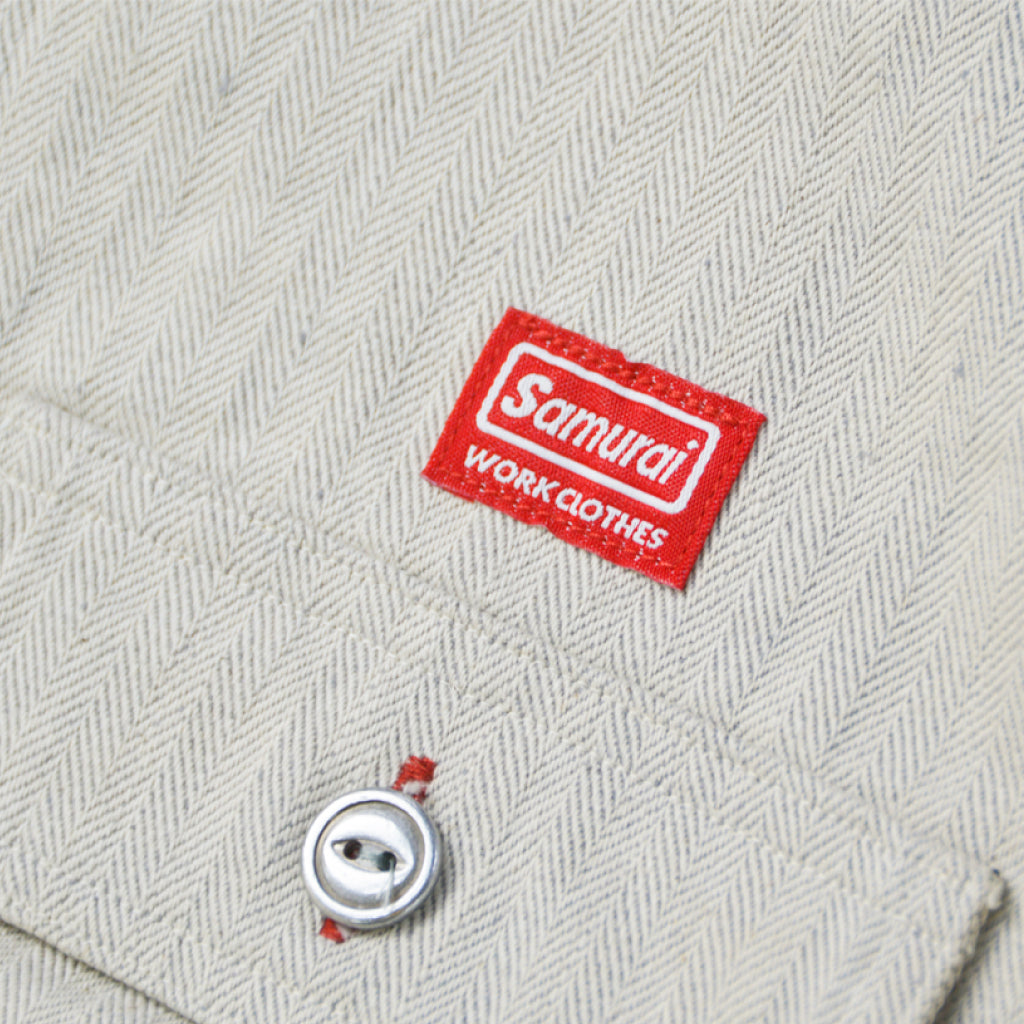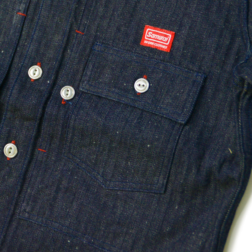 Spec:13oz緯グレーインディゴヘリンボーンデニム/13oz緯グレーブラックヘリンボーンデニム/13oz緯グレーオートミールヘリンボーンデニム/13oz緯グレーオリーブヘリンボーンデニム/アルミ猫目ボタン/Samurai WORK CLOTHESラベル/Samurai WORK CLOTHESネーム/ワンウォッシュ済/日本製