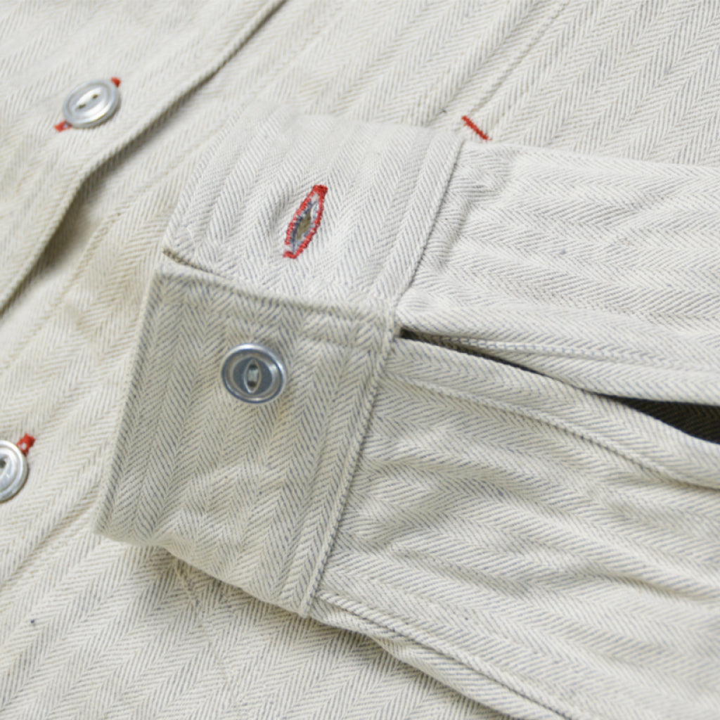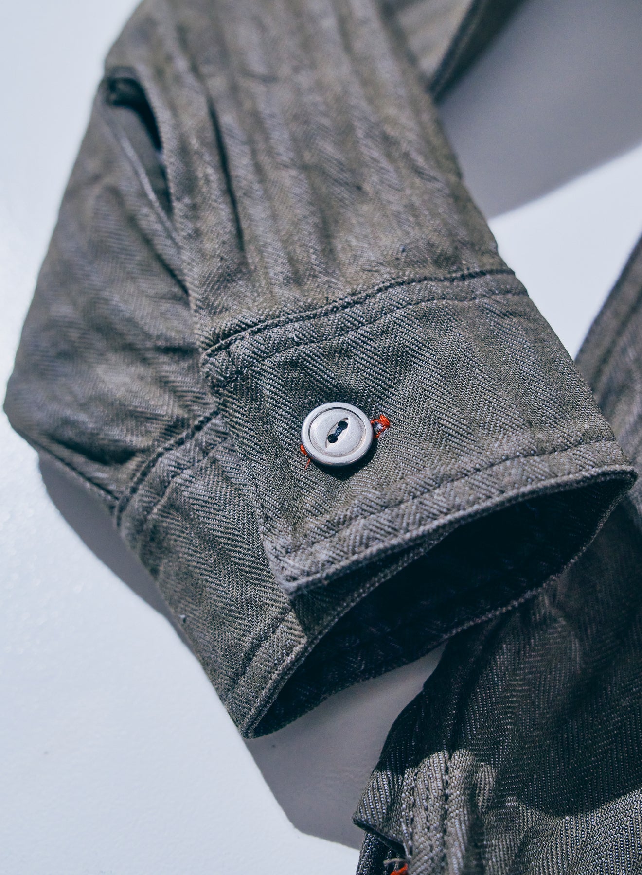 生地は、緯糸にグレー糸を使用したインディゴ・ブラック・オートミール・オリーブの 13ozSWCオリジナルヘリンボーンデニム3色になります。緯にグレーに染めたネップ糸を織り込んでいるので、縦糸の色味と相俟って非常に雰囲気の良い生地に仕上がっています。インディゴは色落ちする事によって左綾が際立ち、たて筋が目立つとストライプ調になり特有のエイジングを楽しめます。ブラックは硫化染料によるロープ染色なので激しい色落ちが期待できます。シャツは、ヘチマ襟・プリズンポケットの仕様で、縫製は巻縫いの力強い仕様をメインとしており、カン止・下糸は赤色糸を使用しました。ボタンは猫目のアルミ仕様です。生地にしっかりとした肉厚もあり、シャツとしてもアウターとしても着て頂けます。