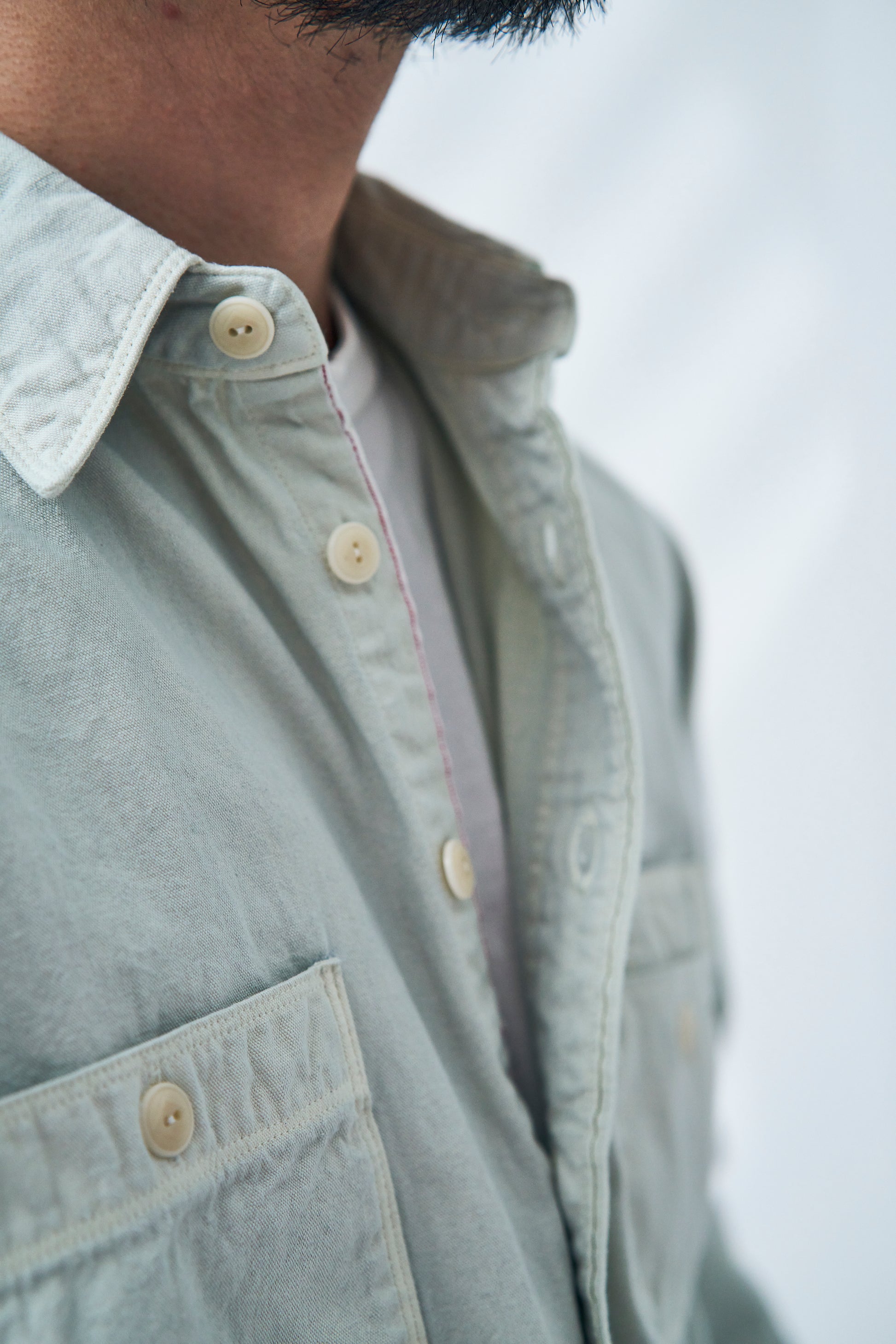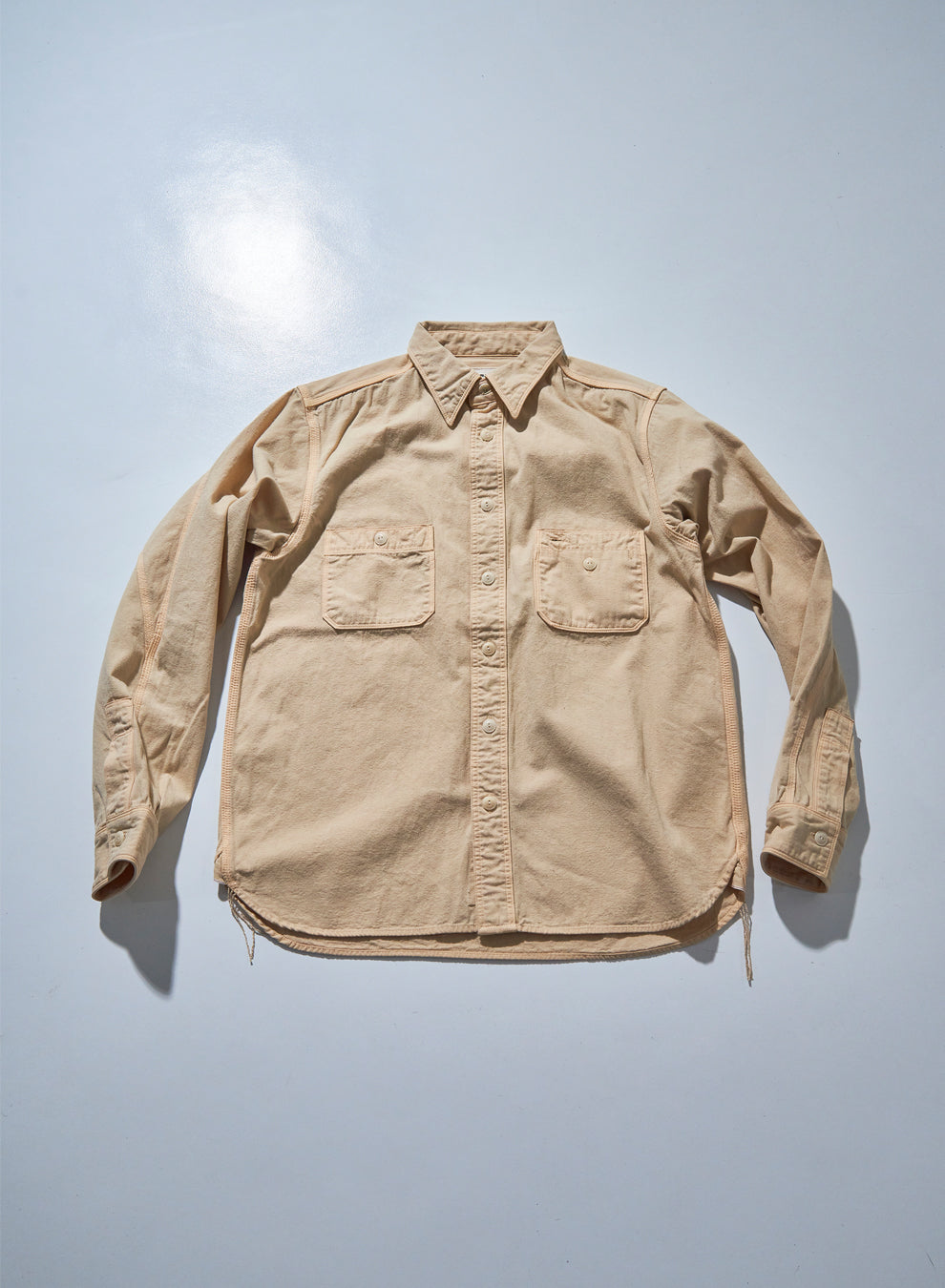 天然のクチナシ染料による草木染めのワークシャツです。生地は縦10番・横20番の糸による8ozの耳付き平織り生地です。染めは、クチナシの葉や実からとった染料と媒染方法で、それぞれのカラーに製品染めしています。シャツはビンテージにみられる左右非対称のポケットで、袖は3枚仕立てにしています。裾マチと下前端に加え、袖裏にもセルビッチをあしらいました。縫製は綿糸を使い、3本ステッチ巻縫いがメインの力強い仕様ですが、太番手細番手の使い方、2本ステッチの幅や、運針の使い分けなど、各部にメリハリを持たせたこだわりの仕様としています。また、脇から袖に入る3本ステッチは、環縫い表出しのユニークな仕様となっています。ボタンは2ツ穴の樹脂ボタンを使用しています。